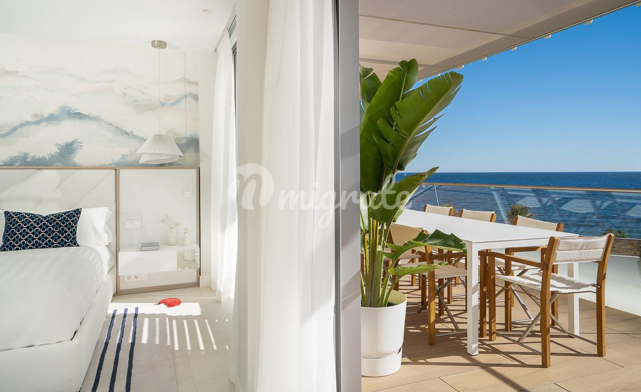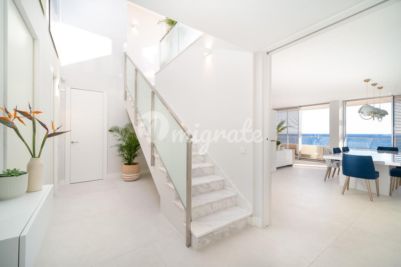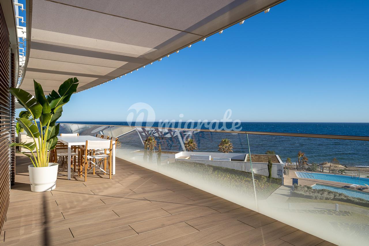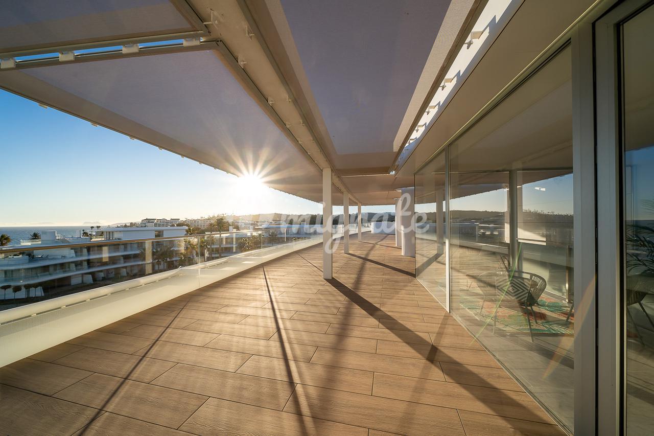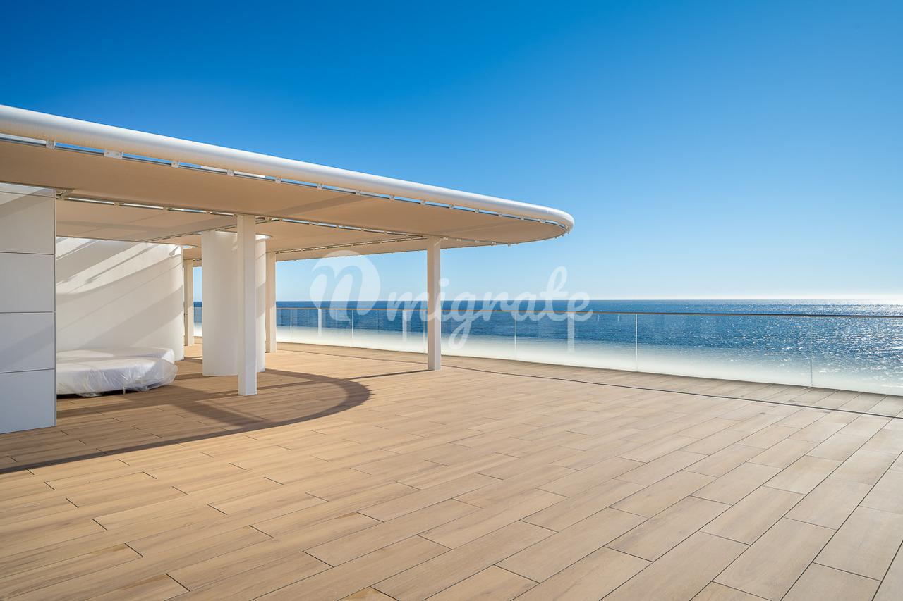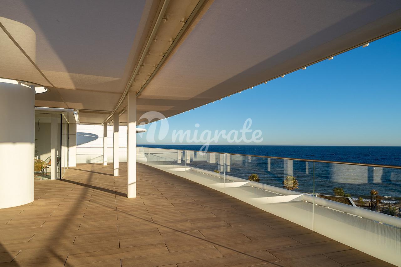 Этот красивый двухуровневый пентхаус имеет 4 спальни с ванными комнатами и гостевой туалет. Гостиная/ столовая с фронтальным видом на море просторная и светлая благодаря многочисленным окнам от пола до потолка. Полностью оборудованная кухня с бытовой техникой Gaggenau. Прекрасная терраса окружает квартиру, что делает ее приватной, и с нее открывается невероятный вид на побережье Средиземного моря. Спальня с ванной комнатой в одном крыле дома и три дополнительные спальни также с ванными комнатами в другом крыле собственности завершают планировку нижнего уровня. На верхнем уровне расположен большой солярий с частным бассейном и панорамным видом на море и горы. Террасы на первом этаже плюс солярий имеют приблизительную площадь 500 м2.