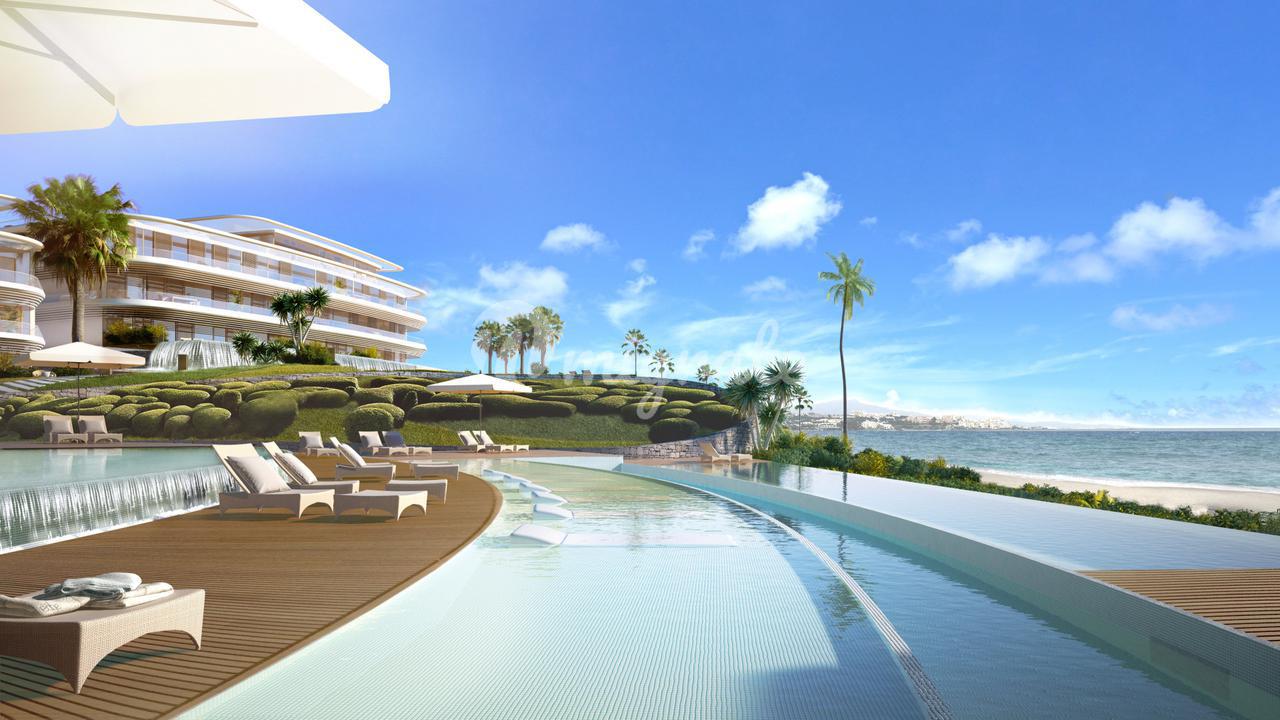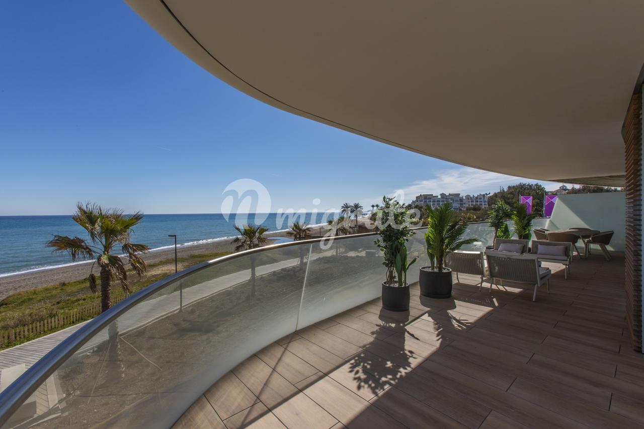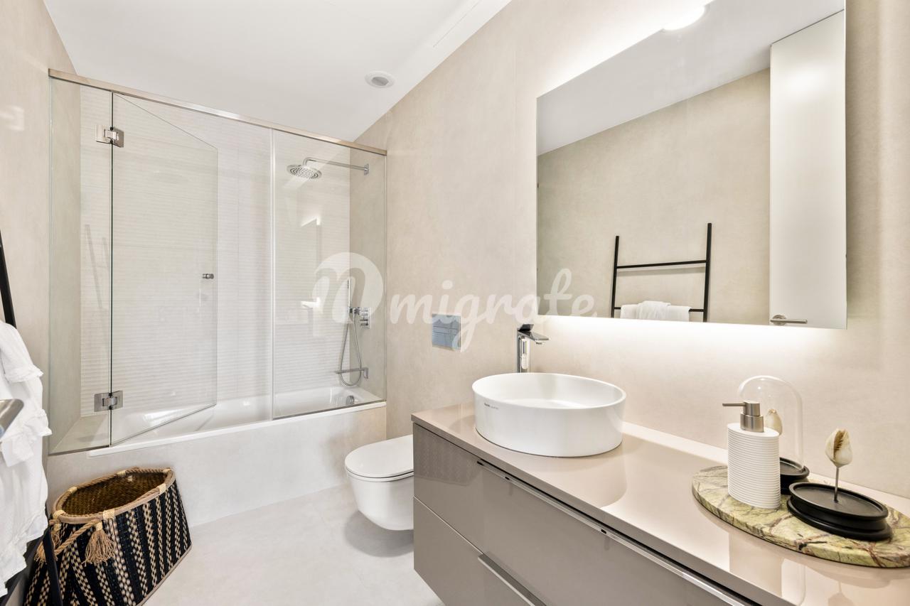 Расположен в комплексе из 70 квартир с видом на море, окруженный в основном бетонной стеной со стеклянными панелями наверху, чтобы сохранить вид. Он безопасен благодаря ограждению периметра, системе видеонаблюдения, круглосуточному контролю доступа как для людей, так и для транспортных средств, а также системе мониторинга для контроля доступа в различные сектора здания. Лестничные перила и места общего пользования выполнены из стекла. Полы в гостиной, кухнях, спальнях, коридорах и прихожей из таких материалов, как керамогранит, напольное покрытие из натурального дерева ироко или доломитовый мрамор. Для лучшей звукоизоляции под все напольные покрытия укладывается ударопрочный лист. Кухня полностью оборудована бытовой техникой Gaggenau, такой как электрическая духовка, микроволновая печь, керамическая и индукционная плиты, вытяжка, двухдверный холодильник и морозильная камера, посудомоечная машина, стиральная машина и сушилка, а также столешницы из Silestone или Corian. Ванные комнаты марки Villeroy & Boch с подвесным биде и туалетом, а также одной ванной Kaldewei в одной из ванных комнат. В квартире есть кондиционер, полы с подогревом и индивидуальная сигнализация, подключенная к центру сигнализации.
