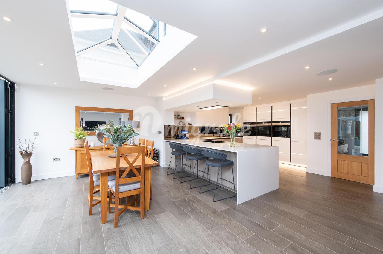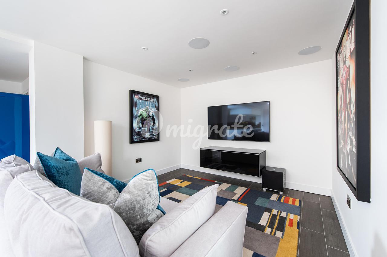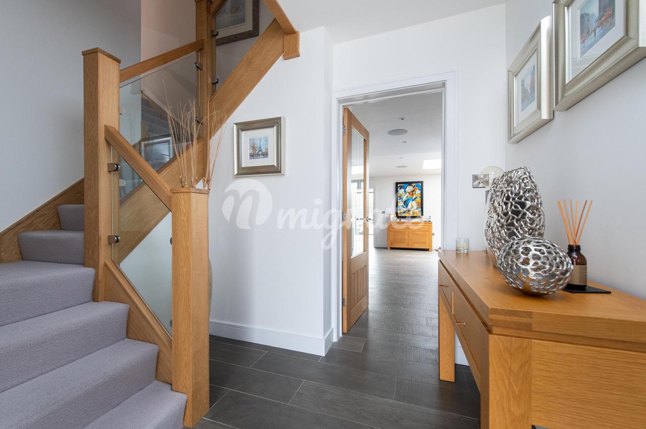 Просторные апартаменты расположены на двух этажах и идеально подходят для современной жизни, благодаря полам с подогревом на всем первом этаже. Существует целый ряд просторных и гибких приемных помещений, включая прекрасную гостиную с эркером и дровяной печью. Прихожая с кафельным полом, гардеробная для гостей и лестница из стекла и дуба, ведущая на второй этаж. Впечатляющая кухня / столовая / семейная комната открытой планировки, безусловно, является центром дома и идеально подходит для семейного проживания. Со вкусом оформленная современная кухня оснащена кварцевыми столешницами, бронзовыми зеркальными накладками и встроенной бытовой техникой, включая индукционную плиту Siemens, посудомоечную машину, холодильник, духовку, пароконвектомат, паровую духовку и два выдвижных ящика для подогрева. Рядом с кухней расположено подсобное помещение с отделением для обуви. Здесь есть большая обеденная зона под фонарем на крыше, пропускающим много света, а двустворчатые двери открываются в сад. Уютная зона отдыха расположена в углу, а еще одна дверь ведет в просторную гостиную с двойным видом на сад и двустворчатыми дверями, выходящими на террасу.