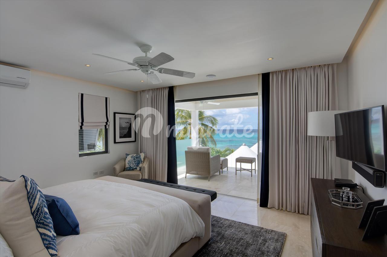 Первый этаж состоит из гостевой спальни и просторной гостиной зоны, выходящей на широкую крытую террасу и несколько открытых площадок с неформальной трапезой, шезлонгами, бассейном и прямым выходом на пляж. На верхнем этаже находятся главная спальня и три дополнительные комнаты для гостей.