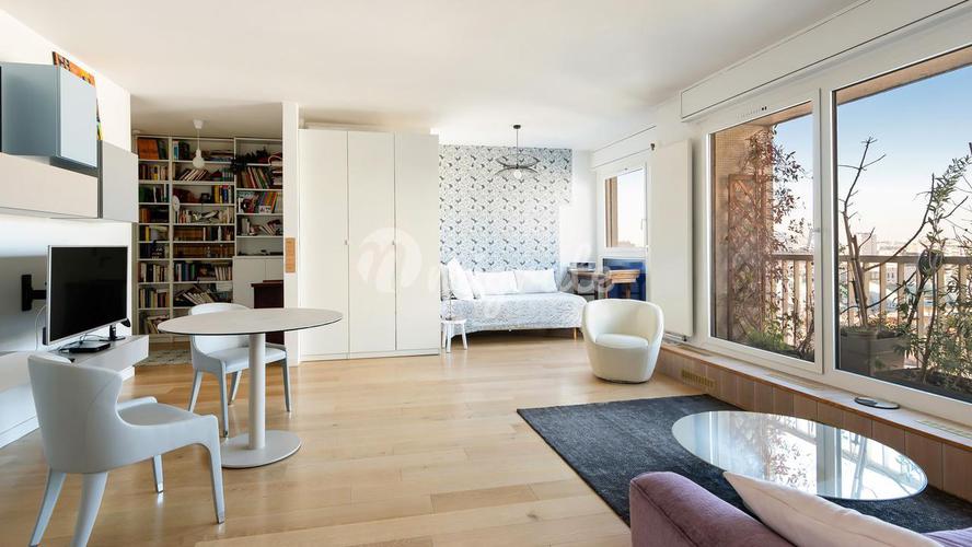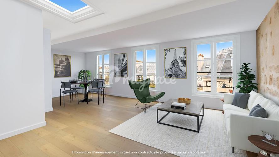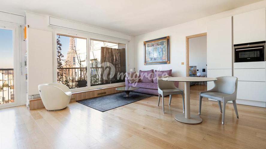 На границе 7-го и 15-го округов. Захватывающий вид на Эйфелеву башню и Трокадеро из этого превосходного верхнего этажа площадью 57,08 кв.м., отремонтированного по закону Карреза без потери пространств