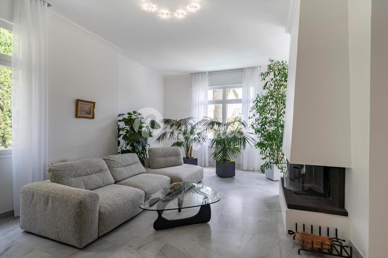 Чрезвычайно светлая вилла состоит из нескольких гостиных с камином, 2 кухонь, 6 спален, 5 ванных комнат и кабинета. Также есть небольшой бассейн с подогревом.