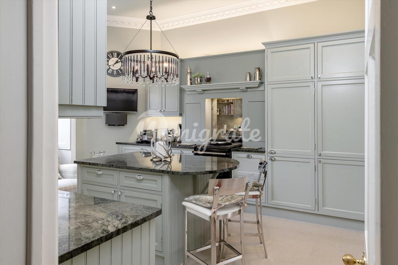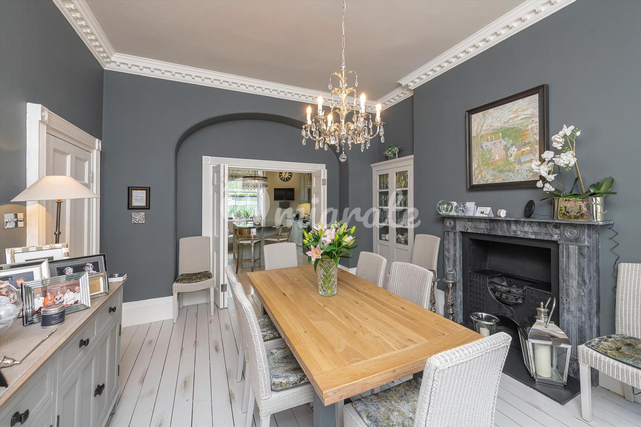 Кухня на первом этаже и прилегающая к ней столовая кажутся свежими и элегантными в оттенках Farrow и Ball, кухня с краном City Aga и Quooker и центральным островом, который создает пространство для общения. Есть много продуманных мест для хранения, кладовая и, в столовой, стеклянные шкафы в каждой из ниш. Свадебные двери соединяют две комнаты, а окна на обоих концах обеспечивают светлое и яркое пространство. Несколько ступеней вниз, но все еще на уровне первого этажа, есть подсобное помещение с выходом в сад, туалет, а верхний этаж стеклянной пристройки – домашний офис/кабинет с видами.