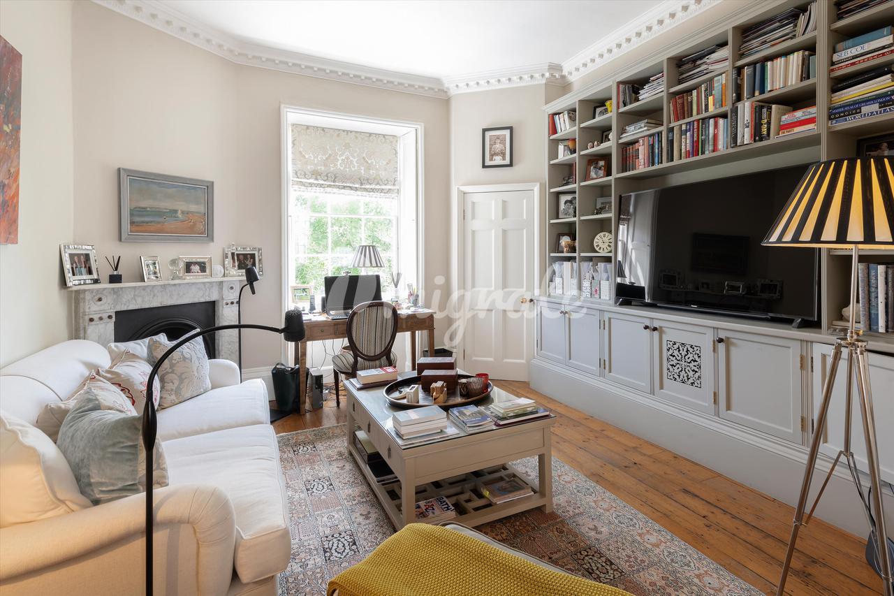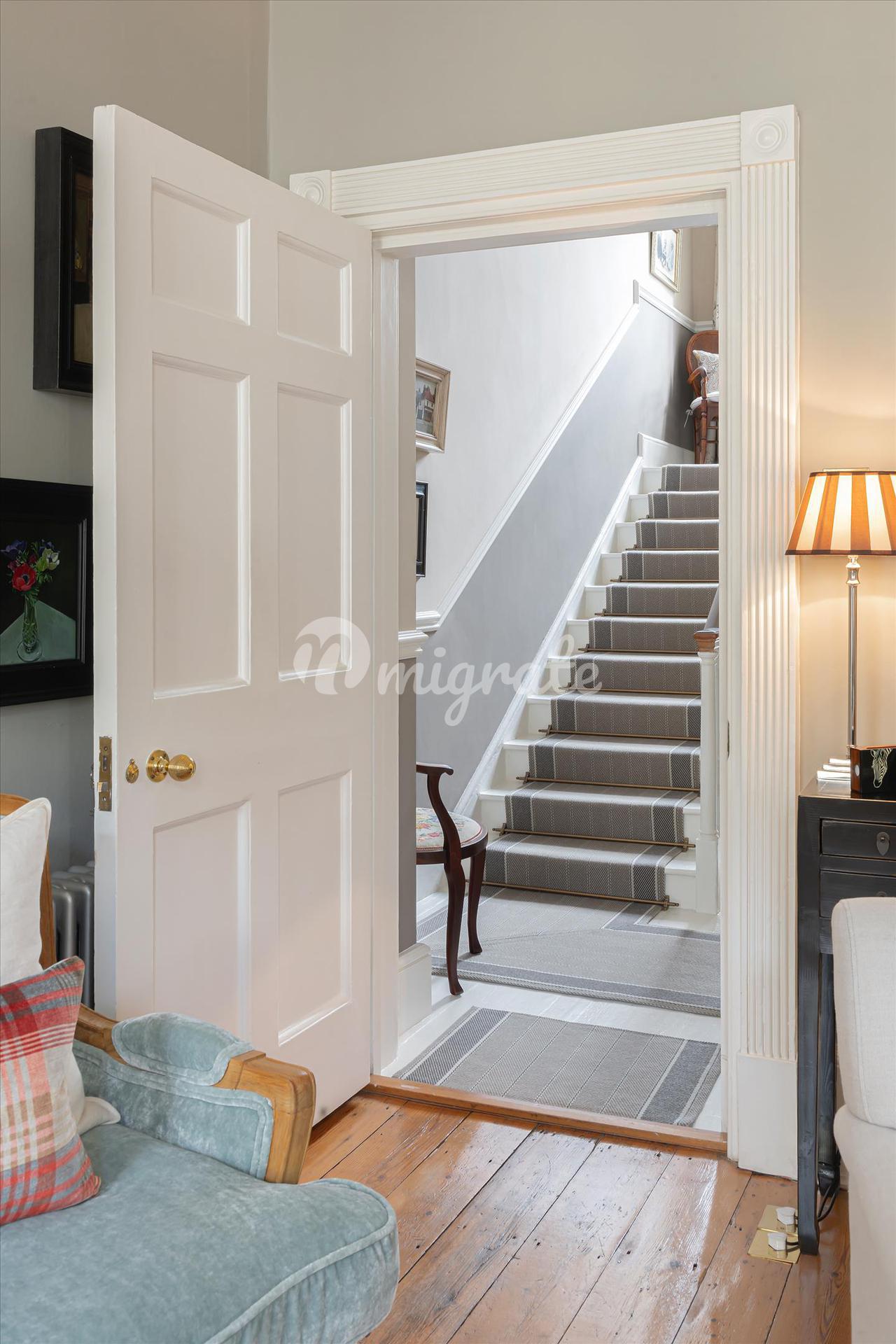 Нижний этаж когда-то был отдельной квартирой и до сих пор сохраняет собственный выход на улицу; Дом находится на двух титулах и LGF на автономной системе отопления, поэтому его можно легко разделить еще раз. На этом этаже есть семейная комната, кухня, спальня и ванная комната, а также садовая комната (которая является нижним этажом стеклянной пристройки) и плавно соединяет внешнюю часть с внутренней. В передней части дома на этом этаже есть доступ к двум хранилищам: одно с полезными шкафами для хранения вещей, а другое с сауной. Несколько ступенек вниз с этого этажа ведут в подвал с большим количеством кладовых. На втором этаже расположены две элегантные комнаты, соединенные межкомнатными дверьми, с деревянными полами, мраморными каминами, встроенными стеллажами и прекрасными старинными окнами со ставнями.