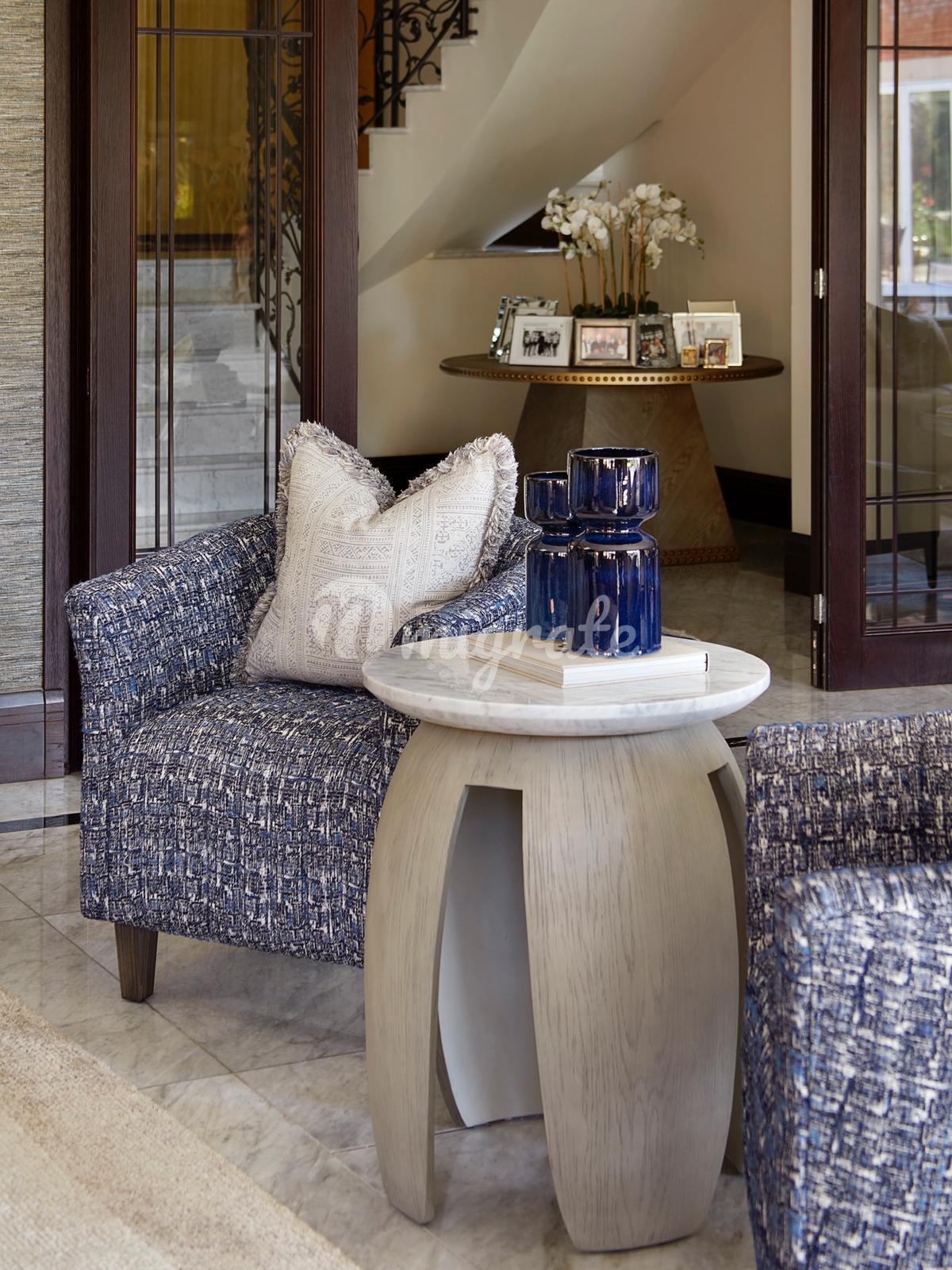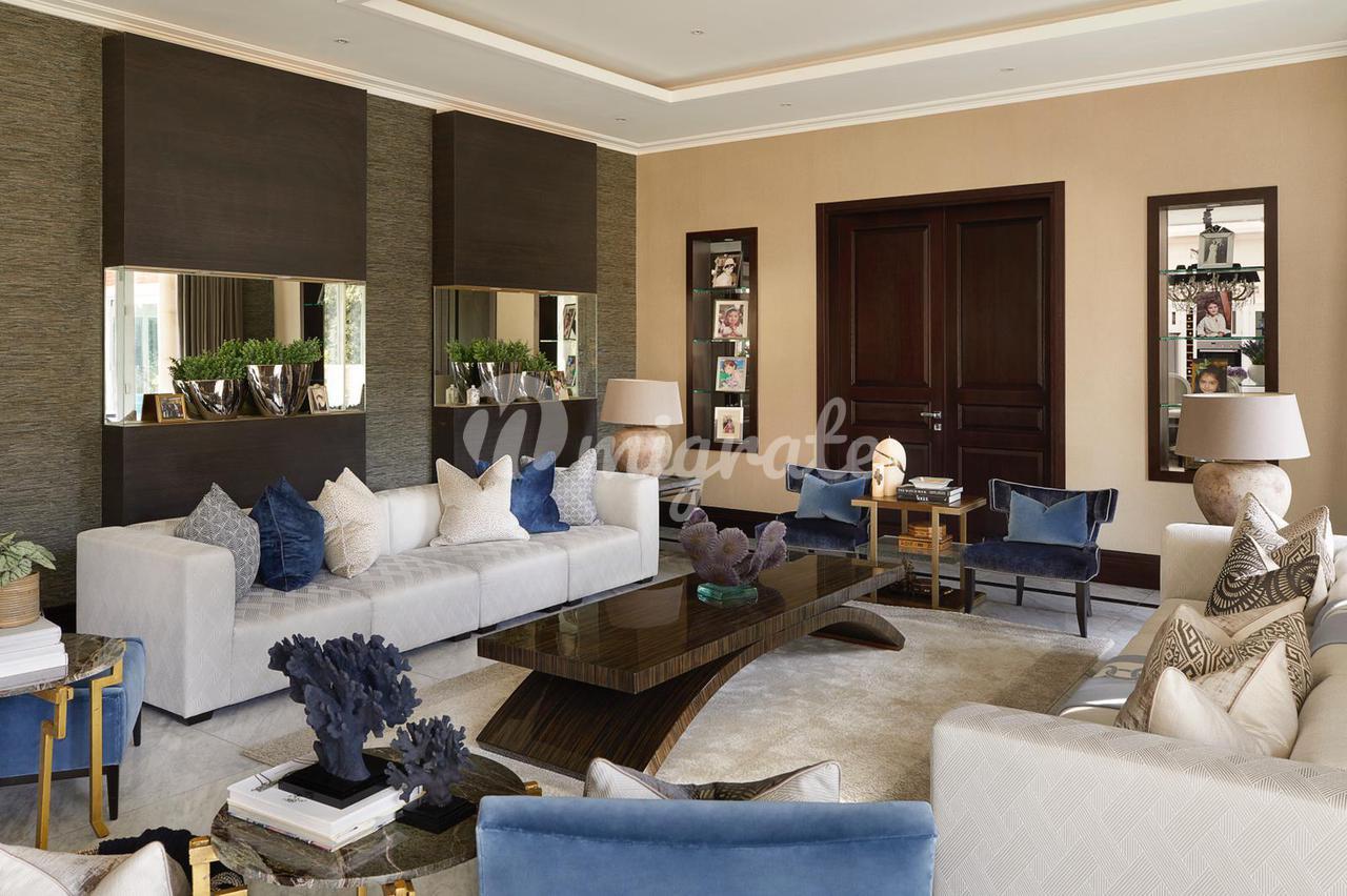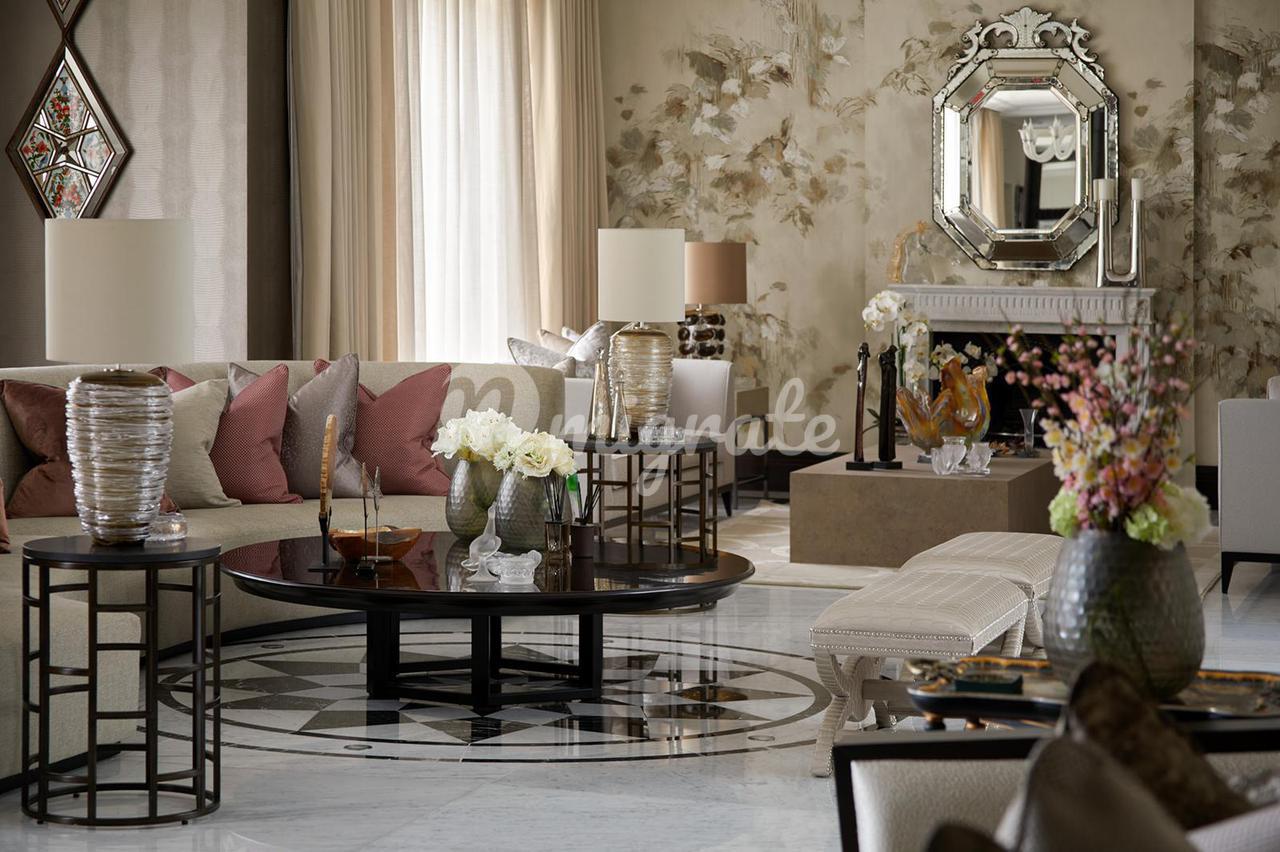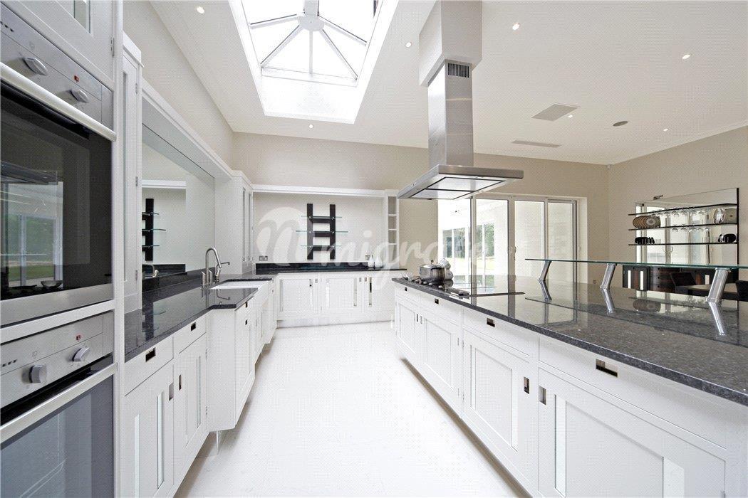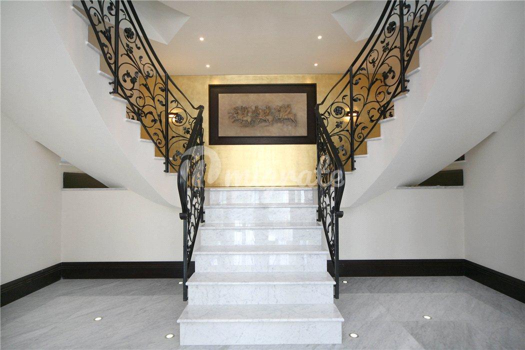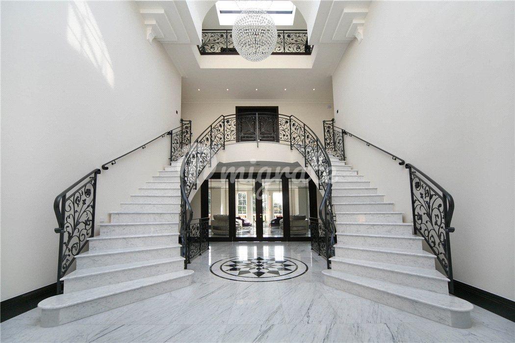 На первом этаже впечатляющий холл двойной высоты имеет великолепную двойную широкую лестницу на второй этаж. Из холла двойные двери в просторную гостиную с выходом на террасу. На первом этаже расположены столовая, кабинет и душевая. На цокольном этаже есть сделанная на заказ кухня/комната для завтрака, вторая кухня для персонала, превосходная семейная комната с двустворчатыми дверями в сад, кабинет и подсобное помещение. На верхних этажах находится элегантная главная спальня с отдельной гардеробной, еще шесть спален и три ванные комнаты. В доме полы с подогревом и кондиционеры в основных комнатах. Снаружи сад простирается на 0,77 акра и просторная парковка перед домом.