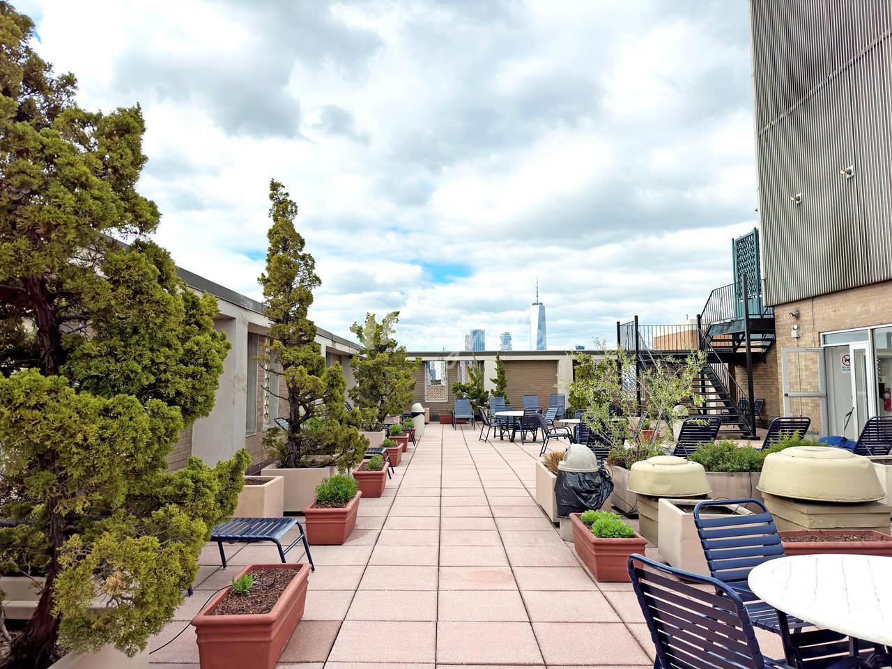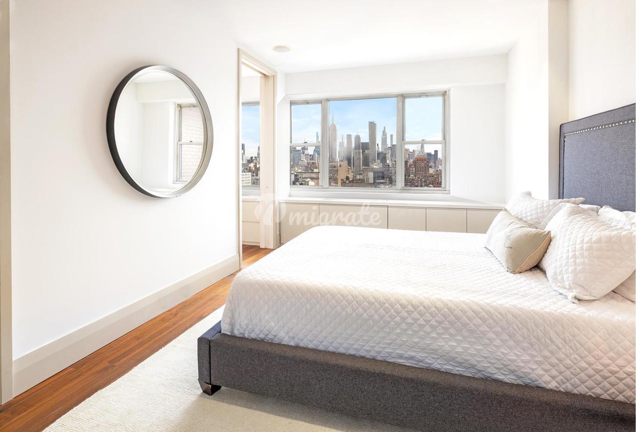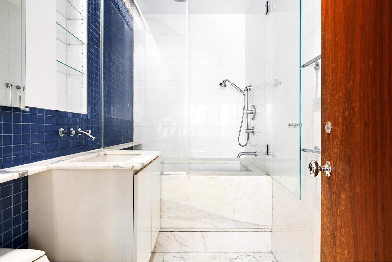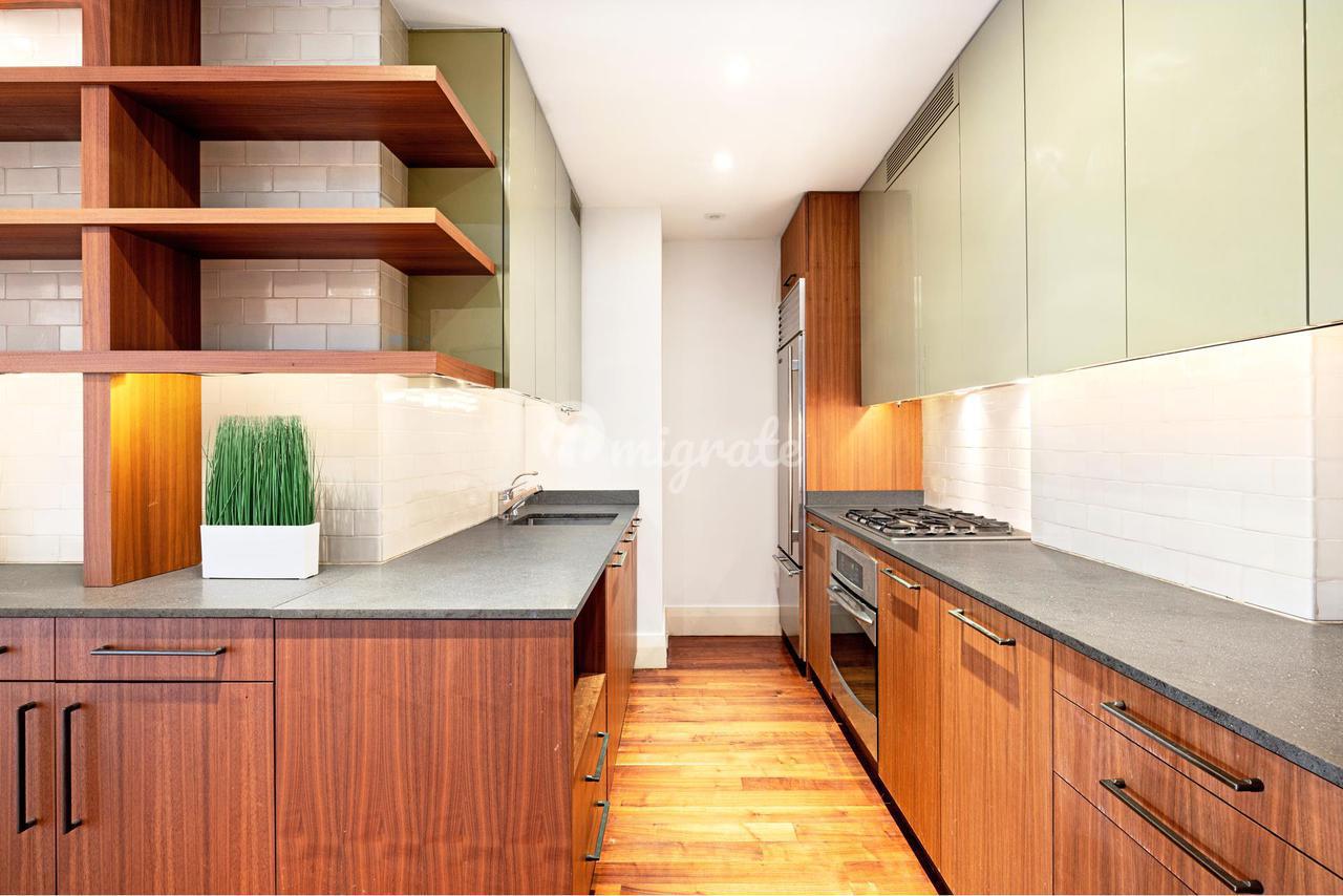 Первоначально квартира была двухкомнатной, но была тщательно перепланирована, чтобы создать двухкомнатную квартиру площадью 1150 квадратных футов с раздвижными дверями, огромной гардеробной, шкафами на заказ и отделанной мрамором ванной комнатой.