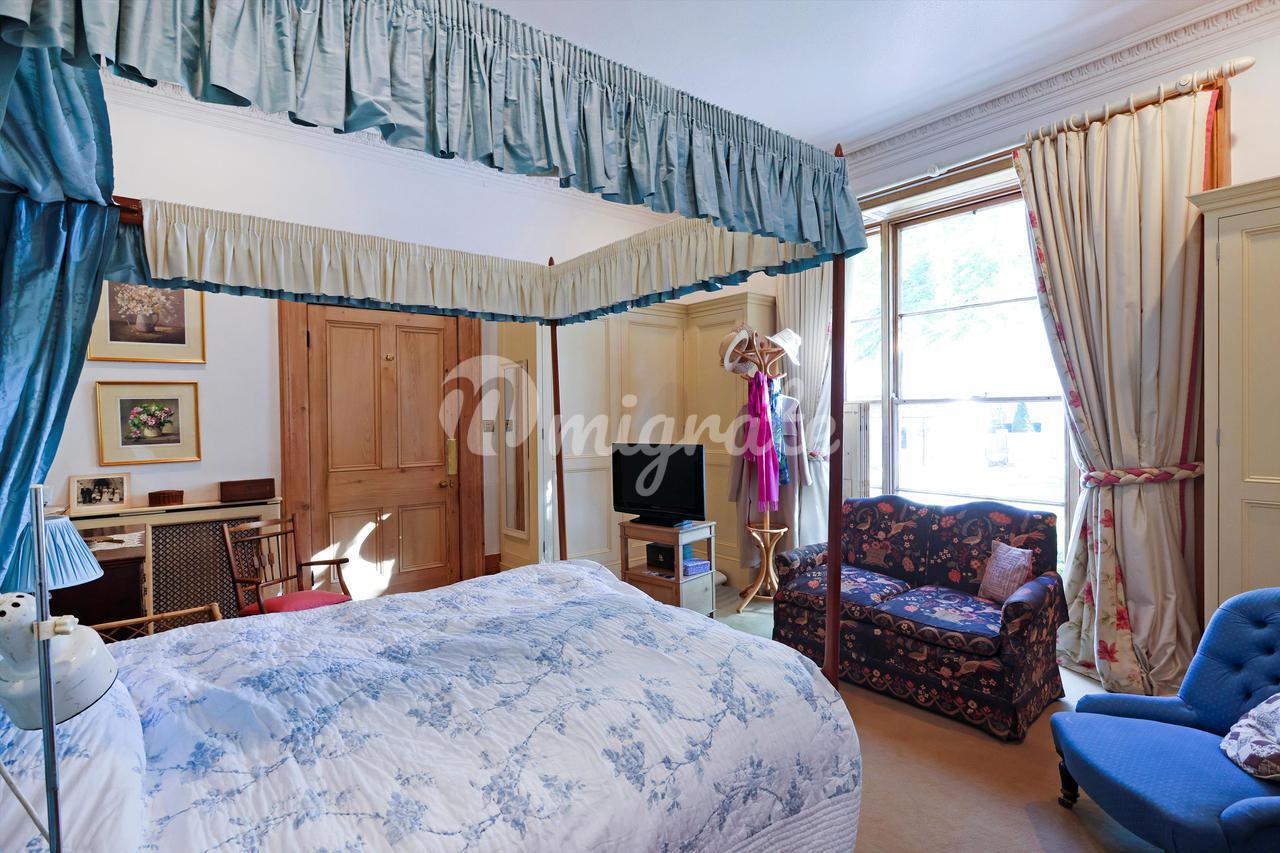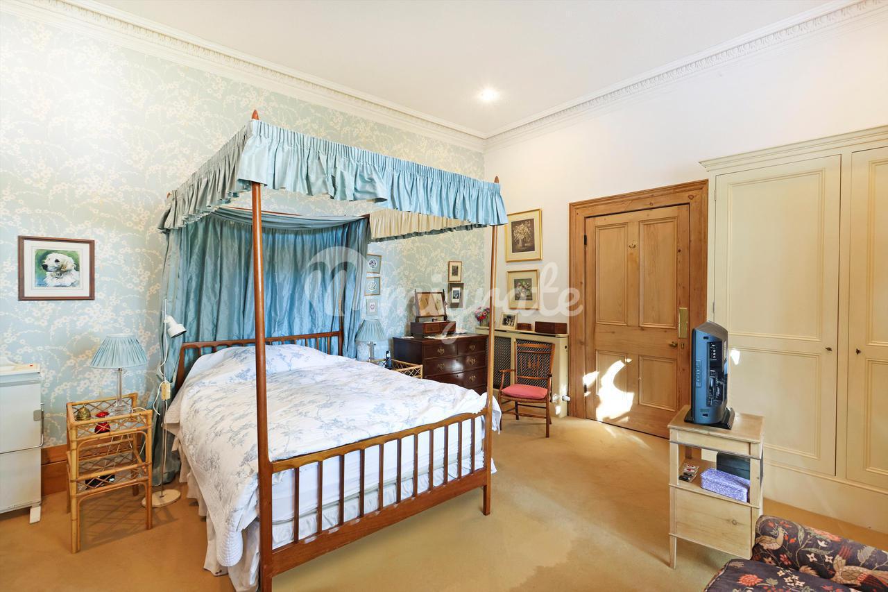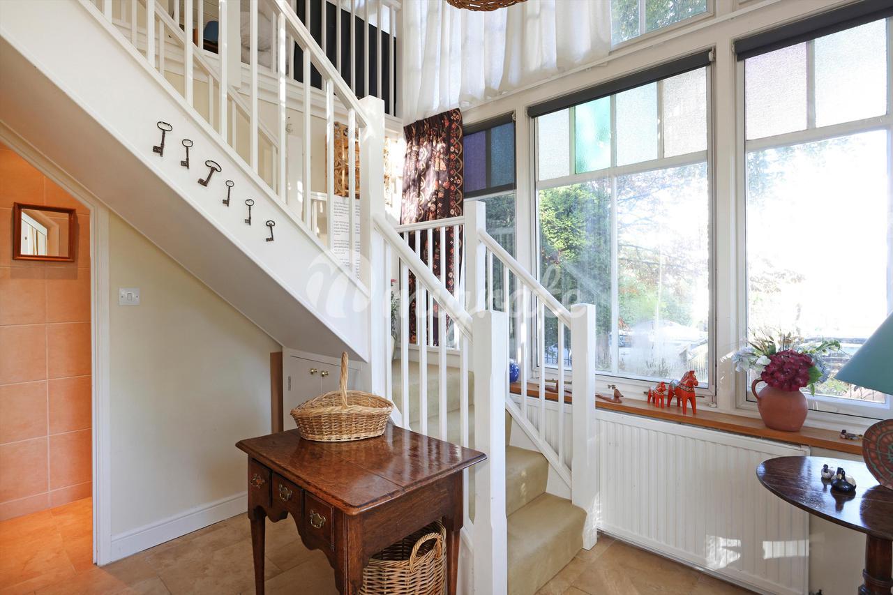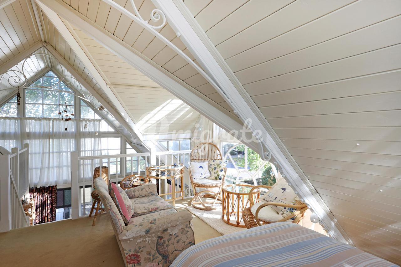 Сбоку от дома есть потрясающая оранжерейная пристройка, соединенная через кухню с лестницей, ведущей в комнату, которая ранее использовалась как студия, но также является отличной спальней для гостей. Отсюда открывается прекрасный вид на сады, а застекленная крыша пропускает достаточно естественного света.
