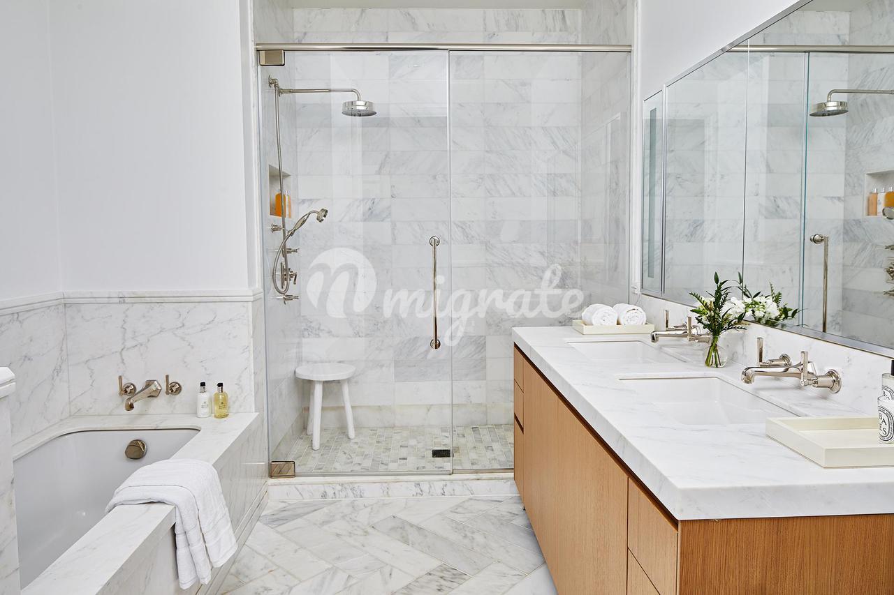 Во второй спальне есть собственная ванная комната. Дополнительная ванная для гостей рядом с фойе отделана эффектной стеклянной плиткой Ann Sacks на фоне элегантного белого мрамора с отдельной ванной для купания, оснащенной светильниками Lefroy Brooks.