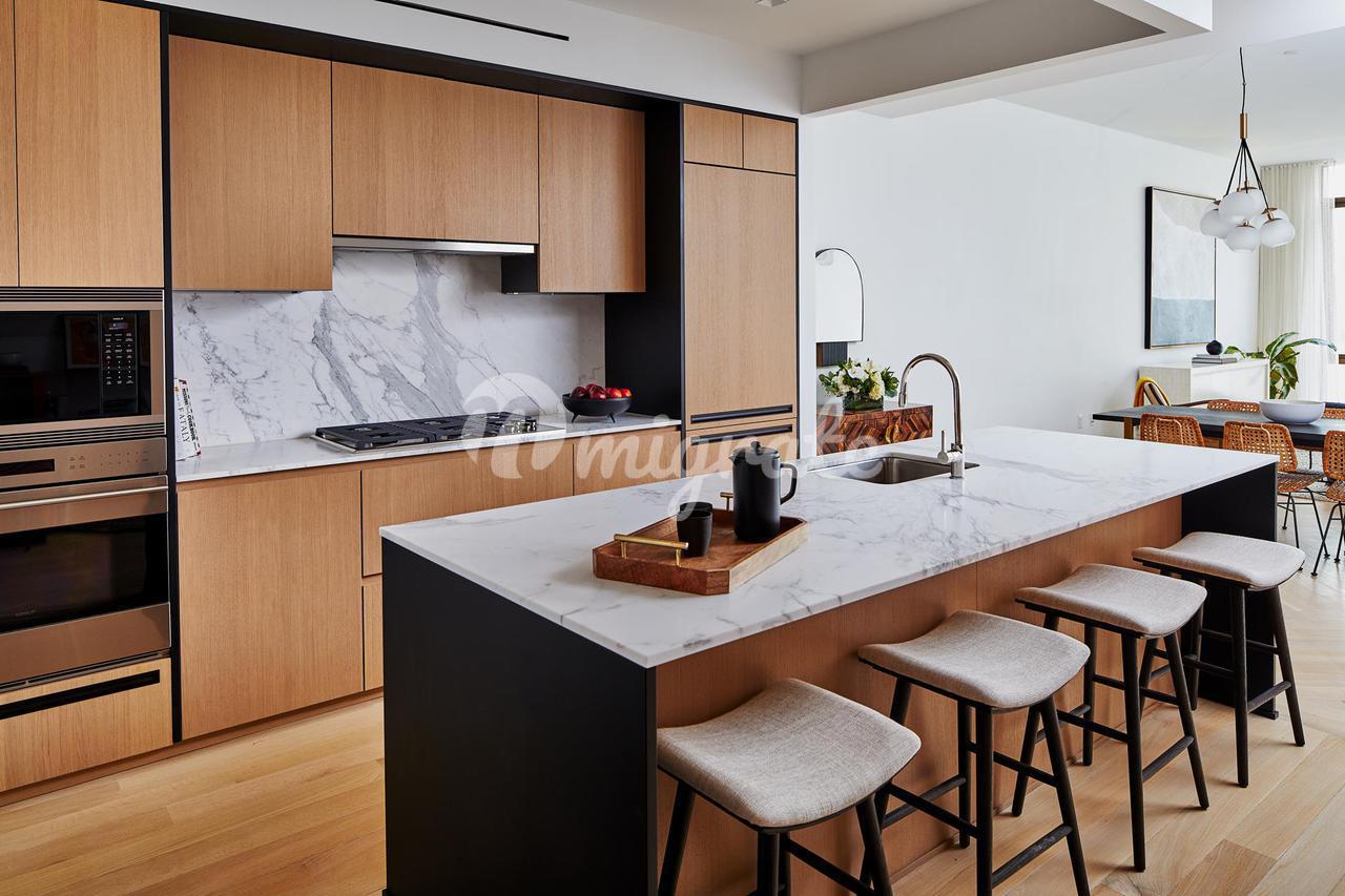Открытая кухня состоит из итальянской мебели, изготовленной по индивидуальному заказу, и столешниц из мрамора Калакатта. Бытовая техника включает духовку Wolf, варочную панель с пятью конфорками, микроволновую печь, посудомоечную машину Bosch, холодильник Sub-Zero и встроенное хранилище для вина. В просторной нише рядом с кухней можно разместить более неформальную столовую или домашний офис. Просторный люкс с основной спальней располагает гардеробной и ванной комнатой с пятью светильниками, полом из белого мрамора с подогревом, двойным туалетным столиком, ванной Duravit и отдельным застекленным душем.