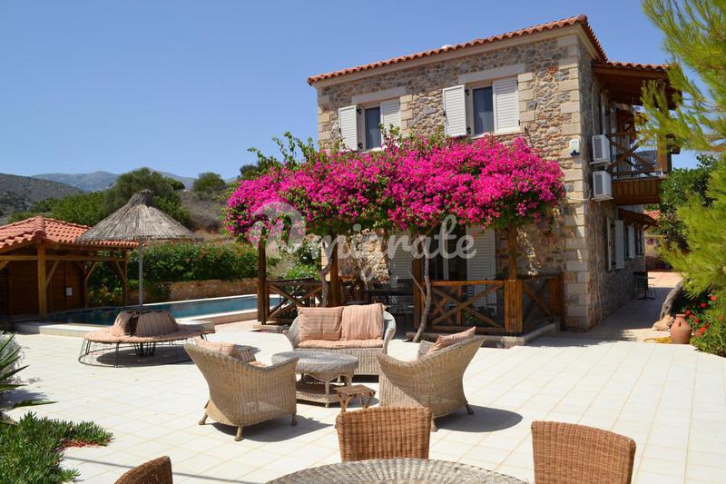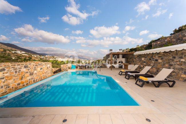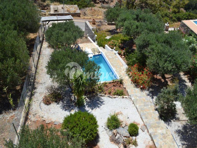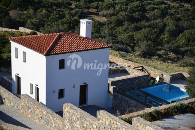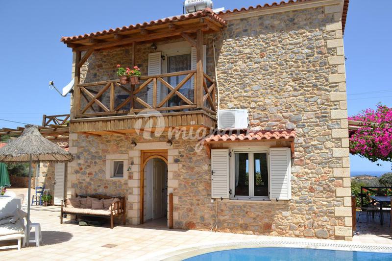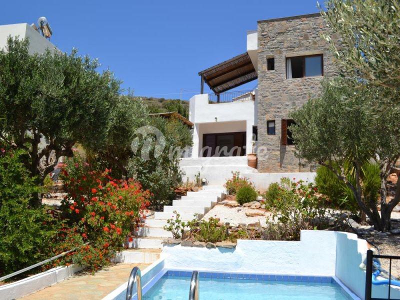 Вилла с видом на прибрежную деревню Милатос расположена в Айос-Николаос на острове Крит с ухоженным садом, крытой парковкой и бассейном. Вилла была построена в 2006 году. Вилла включает два этажа. Пер
