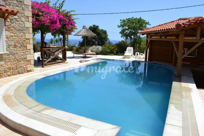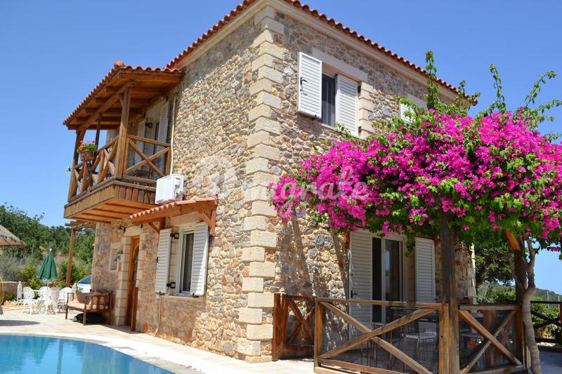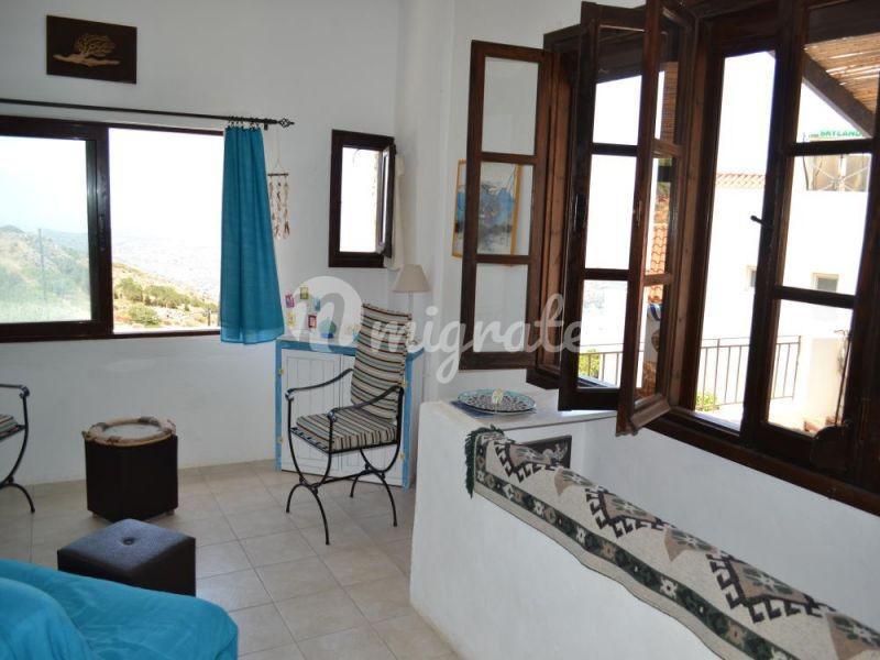 Дом расположен в тихом районе с видом на море, в 4 км от центра города, на участке 2 000 кв. м. Дом включает 2 спальных комнаты, 2 ванные, полностью оснащенную кухню, гостиную с камином и отдельный го