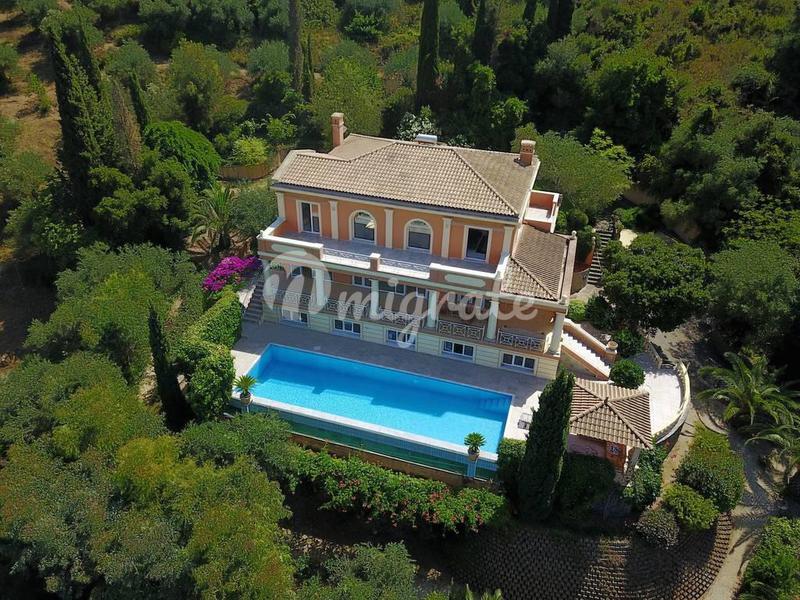 Вилла расположена на участке площадью 4 800 кв. м в нескольких км от центра Корфу. У виллы есть собственный выход к морю. Вилла расположена на трех уровнях. Первый этаж включает просторную гостиную, д