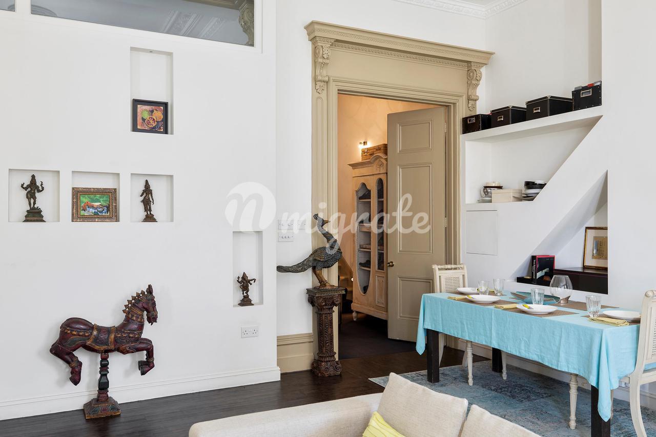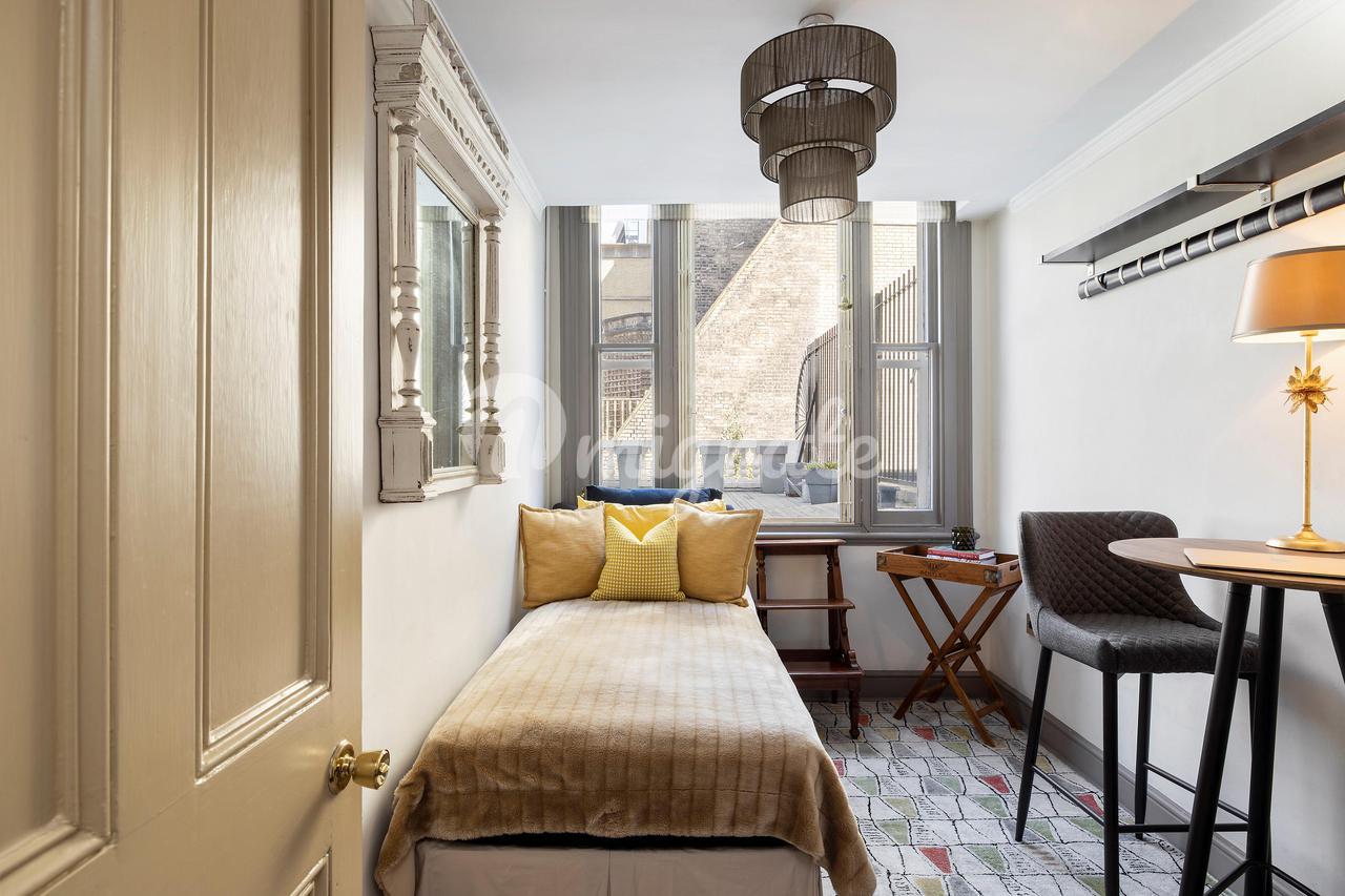 Спальни и ванная комната расположены в задней части здания с видом на сквер и церковь Святого Стефана, а также на исключительно большую террасу, идеально подходящую для занятий йогой на свежем воздухе или ужина на свежем воздухе. Утреннее солнце струится через большие окна в спальнях и ванной комнате, а послеобеденное солнце льется через окна от пола до потолка в гостиной.