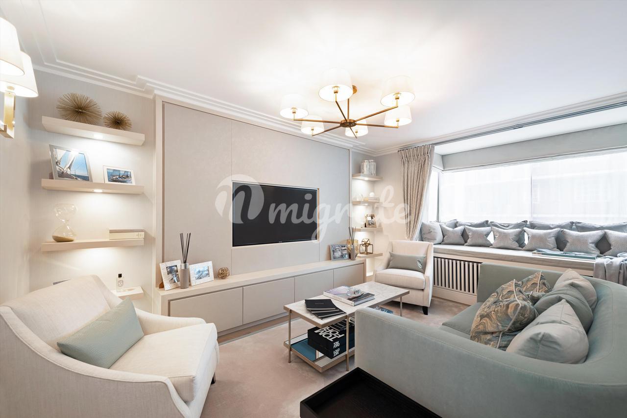 Квартира находится в долгосрочной аренде примерно на 985 лет. Расположенный на втором этаже (с лифтом), дом состоит из гостиной с кухней-столовой открытой планировки, главной спальни с гардеробной, гостевой спальни и отдельной душевой. Приблизительно 84 кв. м (903 кв. фута). В самом здании недавно был проведен обширный ремонт, были установлены новые лифты, а общие части были отремонтированы в соответствии с очень высокими стандартами.