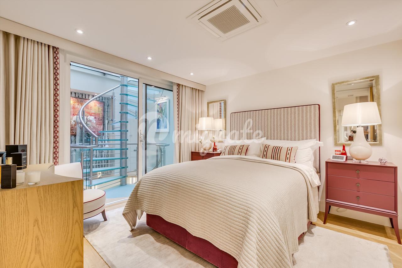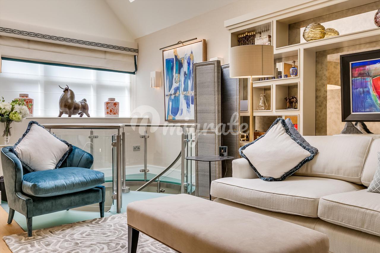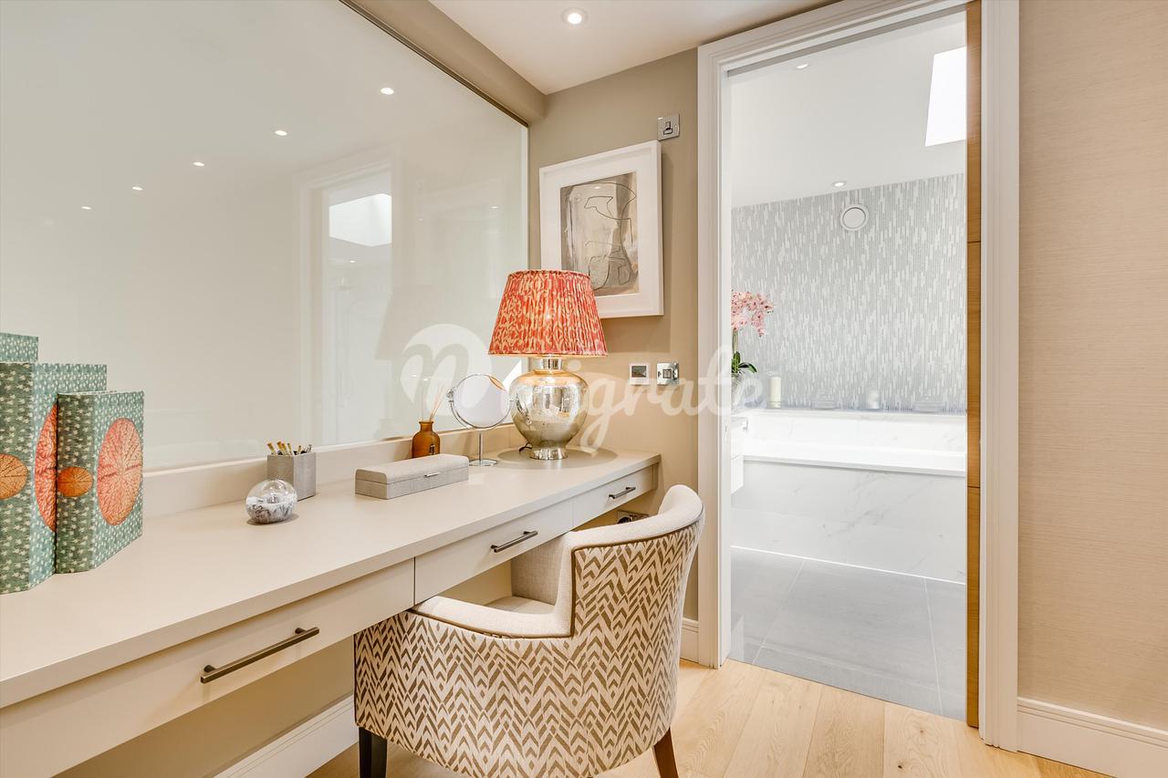 На первом этаже находится современная кухня открытого плана и светлая гостиная. Доступ к цокольному этажу осуществляется по элегантной стеклянной лестнице, через которую проникает естественный свет. Наверху находится очаровательная главная спальня первого этажа с ванной комнатой.