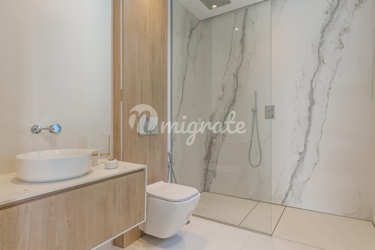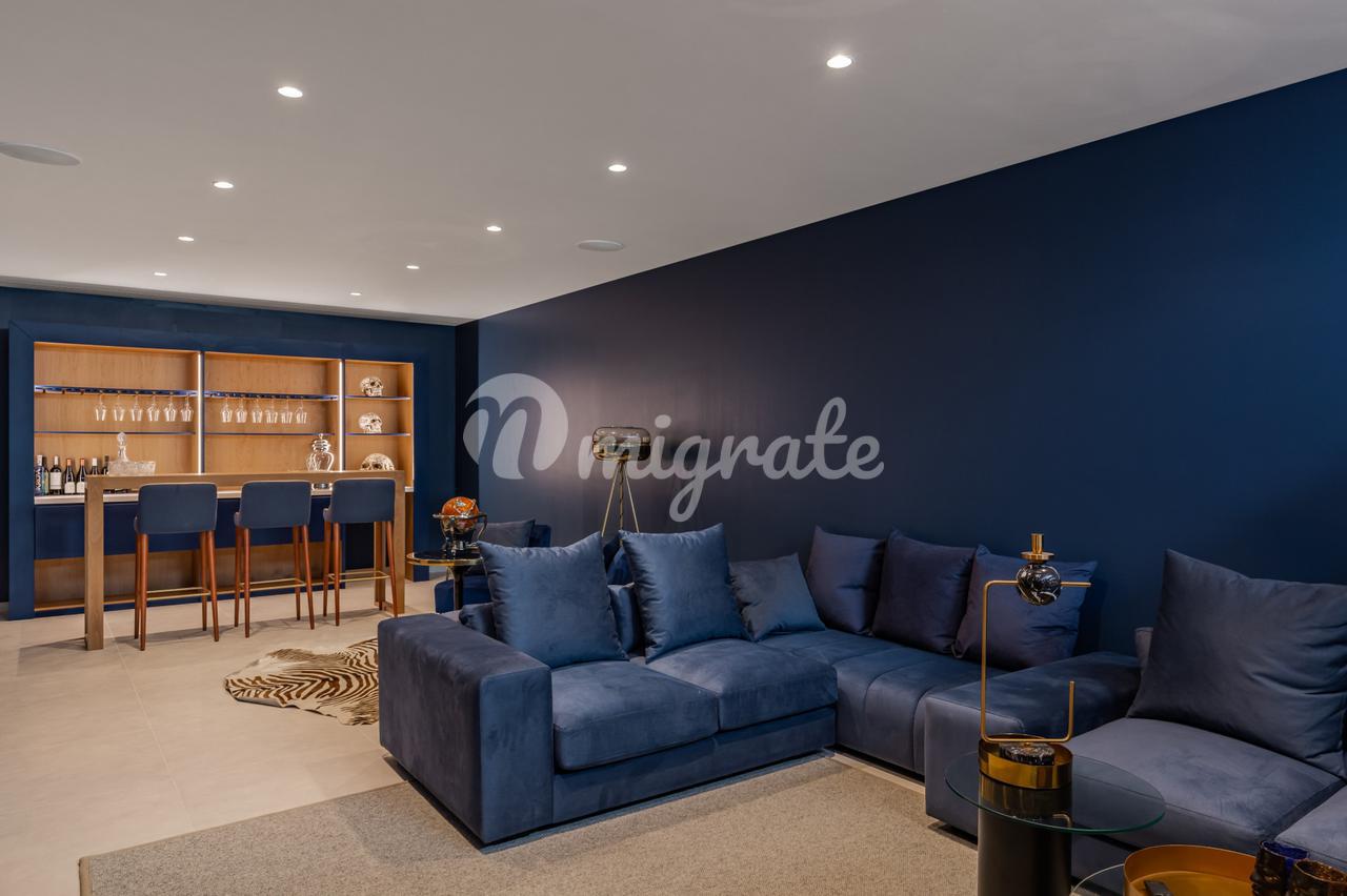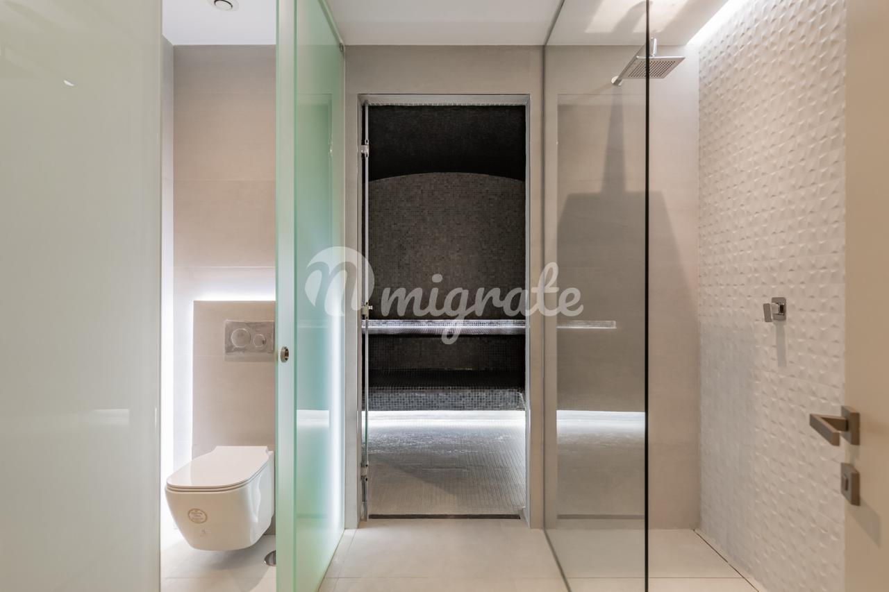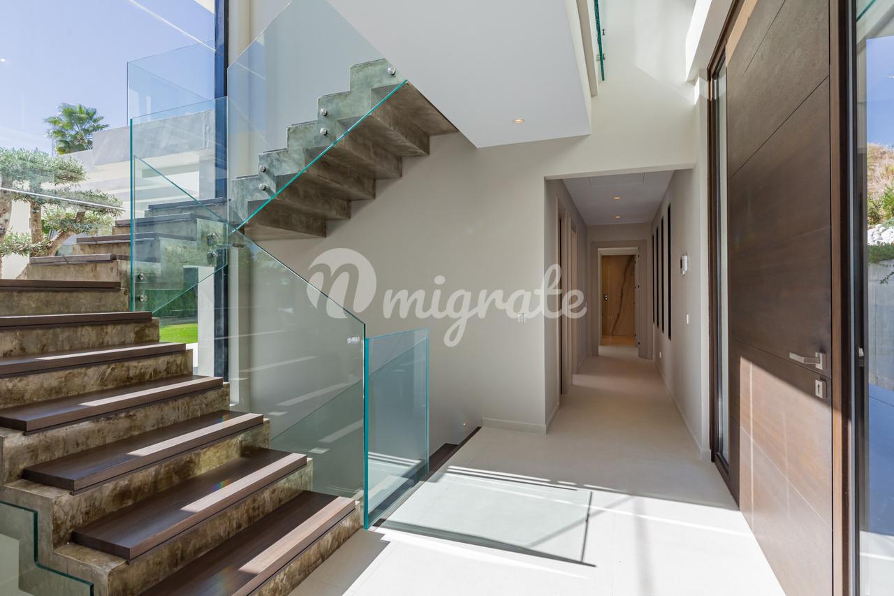 Недвижимость построена на 3 этажах и занимает участок площадью 1420 кв.м. На уровне входа есть гостевой туалет, просторная гостиная с обеденной зоной и полностью оборудованная кухня открытой планировки, оборудованная бытовой техникой Miele, и две спальни с отдельными ванными комнатами.
