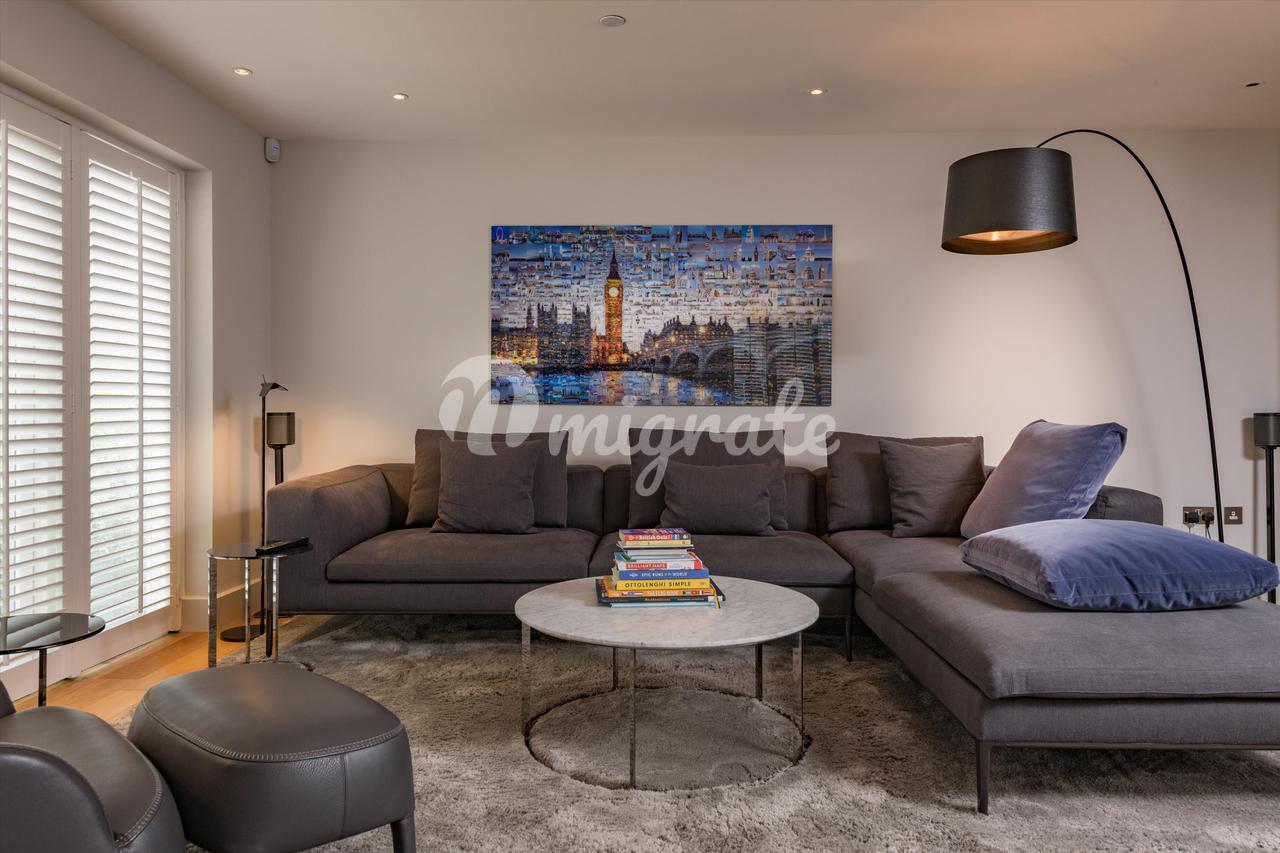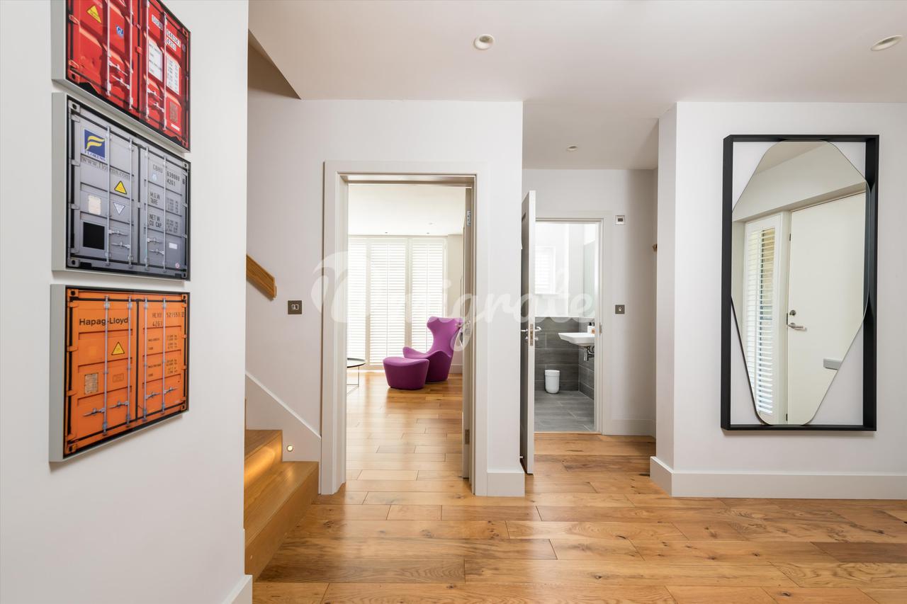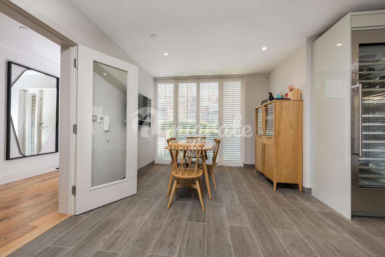С размещением на четырех этажах, включающих 2668 квадратных футов, это солидный дом с парковкой во дворе на две машины, а также охраняемой парковкой в заднем саду. Это самая большая собственность в этом избранном комплексе Sweetcroft Homes. Внутри дом имеет превосходное естественное освещение, а спецификация включает в себя пол с подогревом, твердые бетонные полы, звуковую систему Sonos, обширную аудио-, видео- и информационную инфраструктуру от Smartnest. Договоренность включает пять спален с ванными комнатами с двуспальными кроватями с мужской спальней, занимающей весь верхний этаж. На первом этаже есть холл, большая кухня / зал для завтрака, подсобное помещение, семейная комната и гардероб. На первом этаже есть большая гостиная, кабинет и спальня с ванной комнатой с душем. Второй этаж с тремя спальнями с ванными комнатами и прачечной, а также верхний этаж с главной спальней с гардеробной. Перед домом есть небольшой сад, а сзади - обнесенный стеной сад, в основном положенный на лужайку с мощеной террасой.
