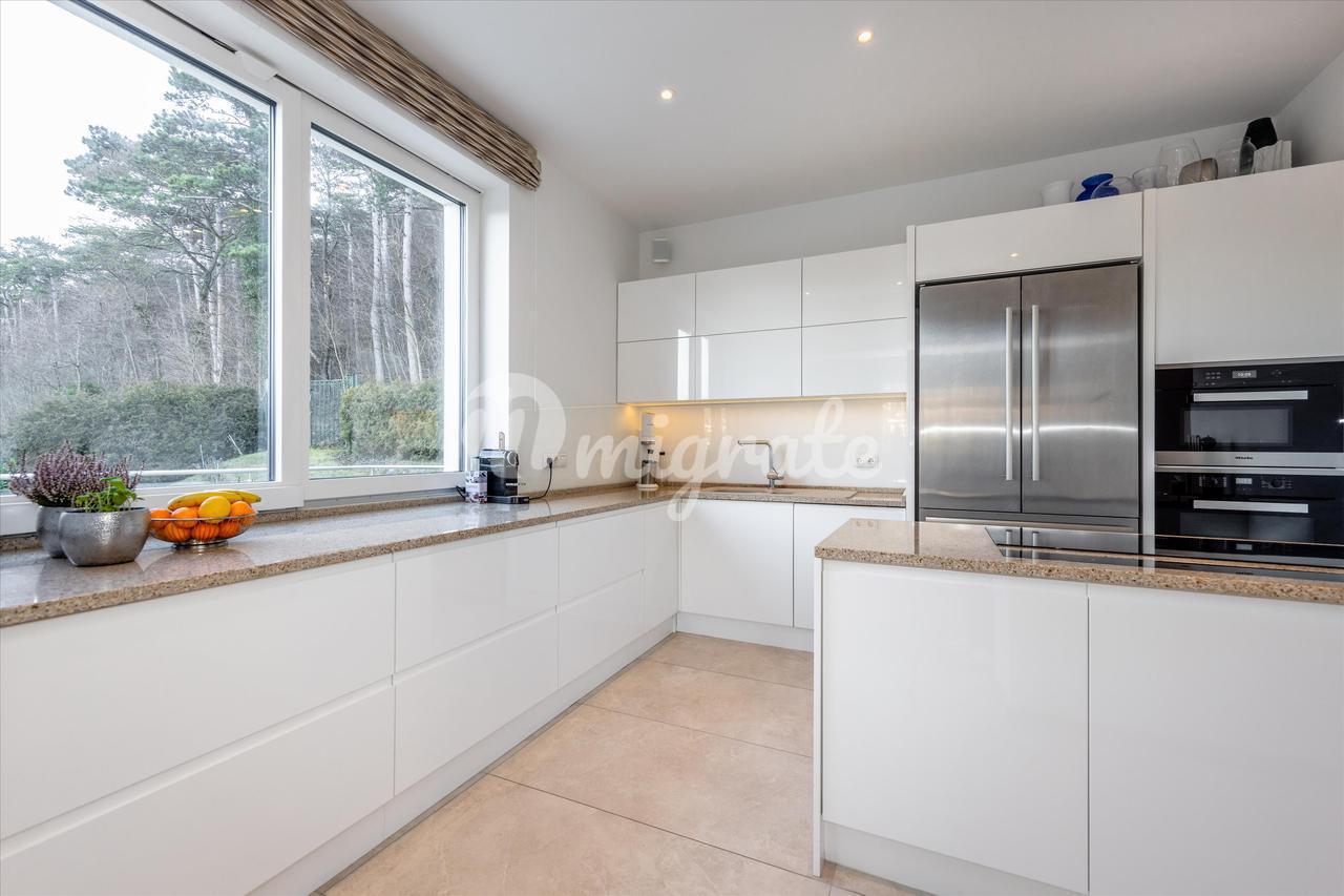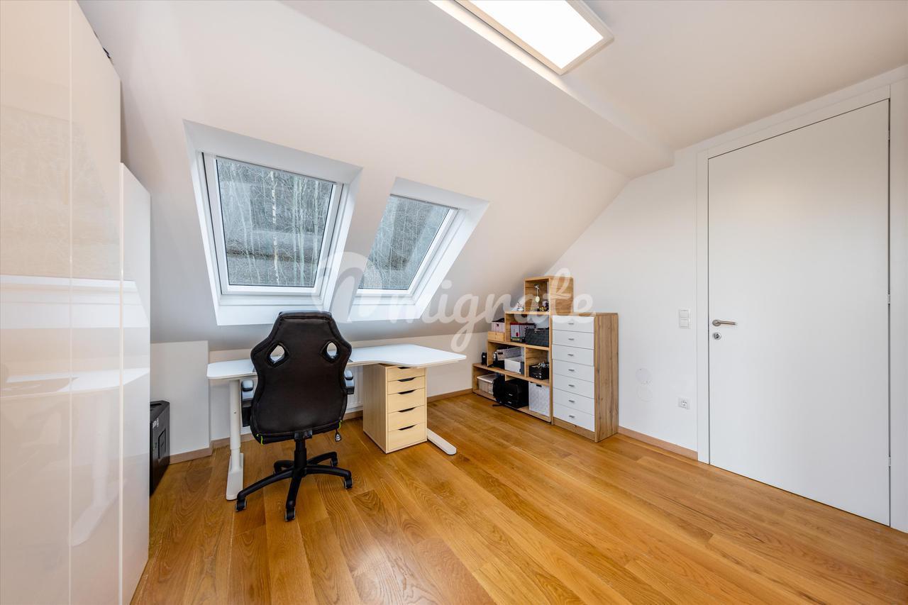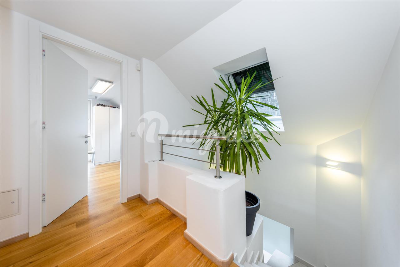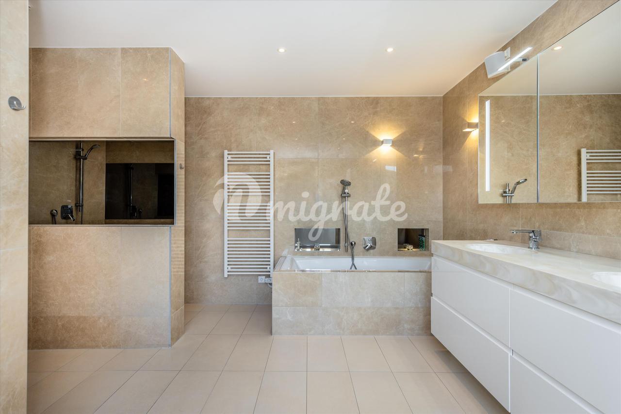 Из-за расположения на склоне холма входная зона находится на мезонине (ок. 93,58 кв.м). Из прихожей вы попадаете в светлую гостиную с красивым эркером, столовую и примыкающую к ней открытую кухню. Терраса площадью ок. 24,5 кв.м., куда можно попасть из обеденной зоны, идеально подходят для наслаждения утренним солнцем. На этом этаже также есть кабинет и гостевой туалет. На первом этаже (около 106,59 кв.м.) находится главная спальня с эркером и прекрасным видом, гардеробная, просторная ванная комната с душевой кабиной, ванной, двойной раковиной и туалетом, еще один кабинет, кладовые, подсобное помещение и второй вход.