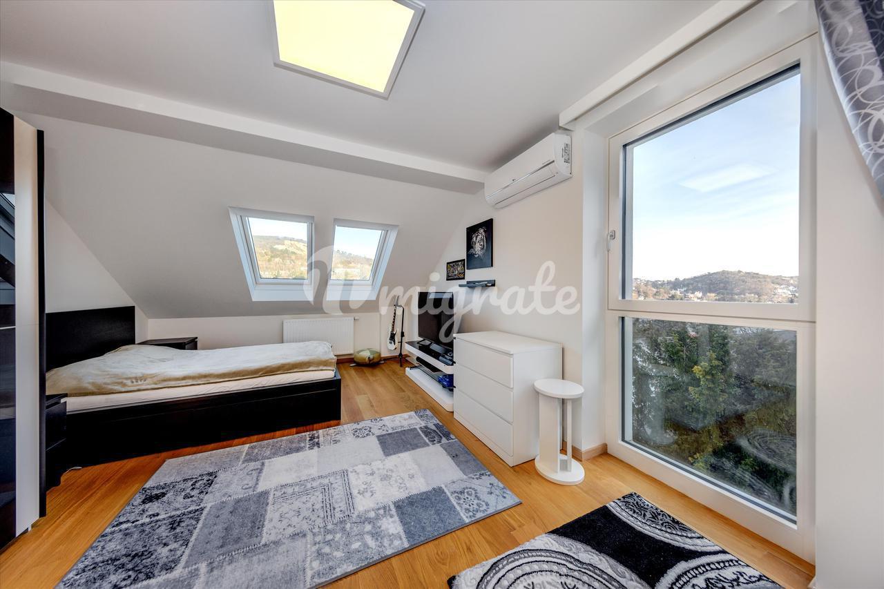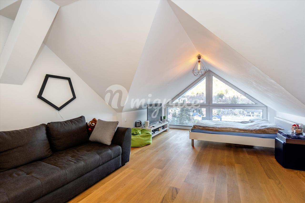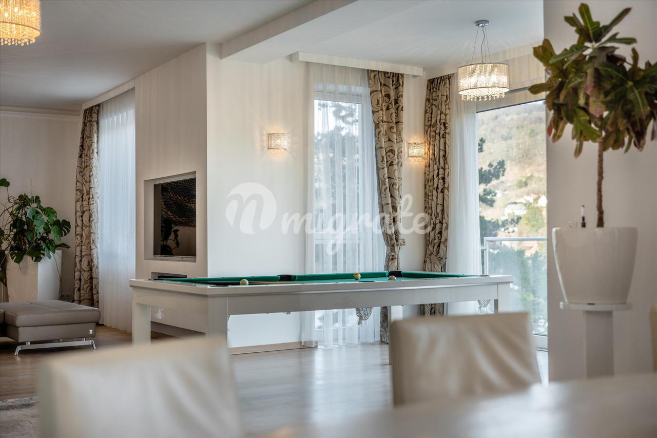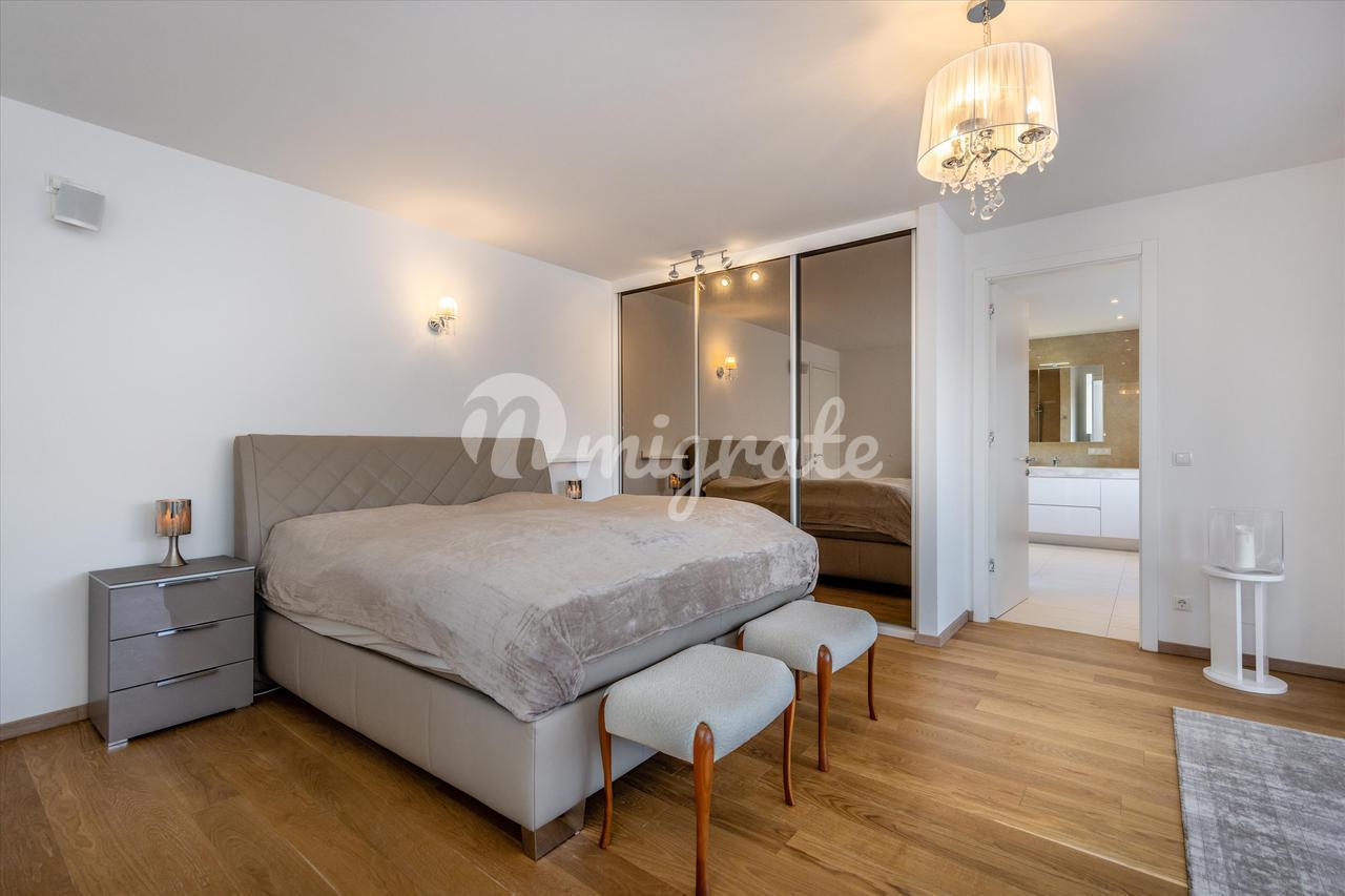 Из-за расположения на склоне холма входная зона находится на мезонине (ок. 93,58 кв.м). Из прихожей вы попадаете в светлую гостиную с красивым эркером, столовую и примыкающую к ней открытую кухню. Терраса площадью ок. 24,5 кв.м., куда можно попасть из обеденной зоны, идеально подходят для наслаждения утренним солнцем. На этом этаже также есть кабинет и гостевой туалет. На первом этаже (около 106,59 кв.м.) находится главная спальня с эркером и прекрасным видом, гардеробная, просторная ванная комната с душевой кабиной, ванной, двойной раковиной и туалетом, еще один кабинет, кладовые, подсобное помещение и второй вход.