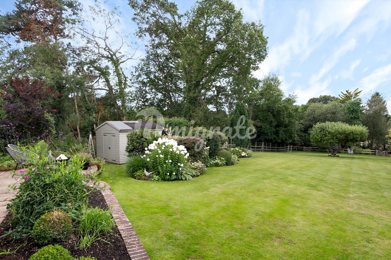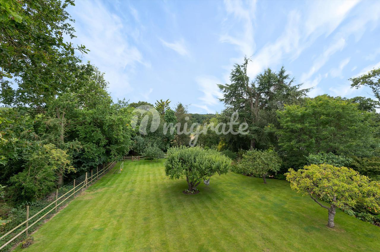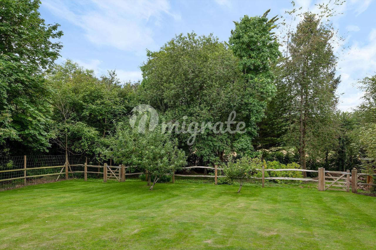 Территория простирается в общей сложности примерно на 0,65 акра, а задние сады имеют вид на запад и граничат с двух сторон с лесами и полями, что придает ощущение загородности внешним пространствам с солнечной террасой во всю ширину, ведущей на лужайки, которые в конечном итоге ведут через закрытый столб и перила, огороженный диким садом и бревенчатым складом по направлению к задней границе.