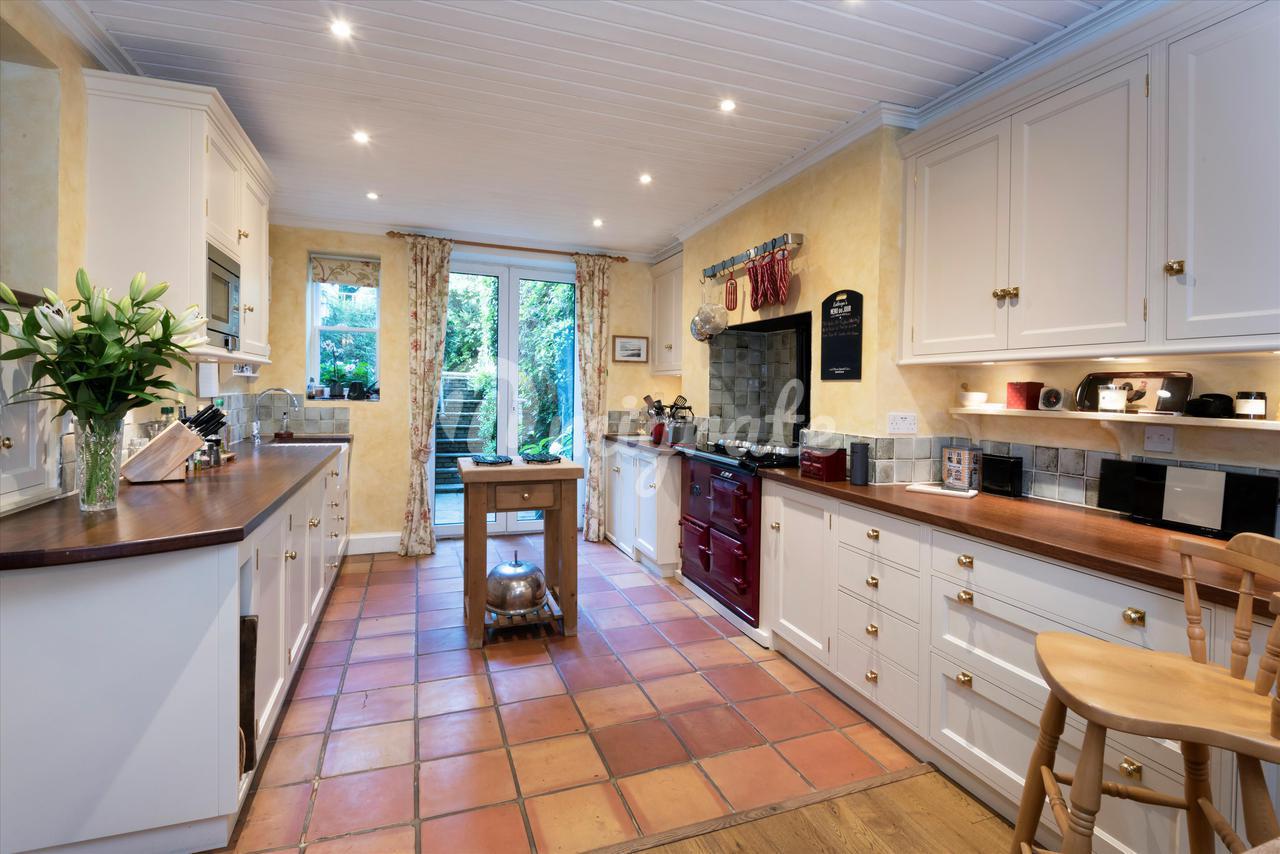 Большую часть нижнего этажа занимает кухня / столовая, которая имеет двойную планировку с эркером спереди и французскими дверями, ведущими в восхитительный внутренний дворик сзади. Кухня, изготовленная на заказ известными краснодеревщиками Rencraft, была полностью оснащена привлекательным ассортиментом настенных и базовых блоков, а также газовой плитой Aga. К нему примыкает подсобное помещение, которое обеспечивает дополнительный доступ во внутренний двор и сад. Котельная служит одновременно и помещением для проветривания, с полезной мастерской на одном конце.