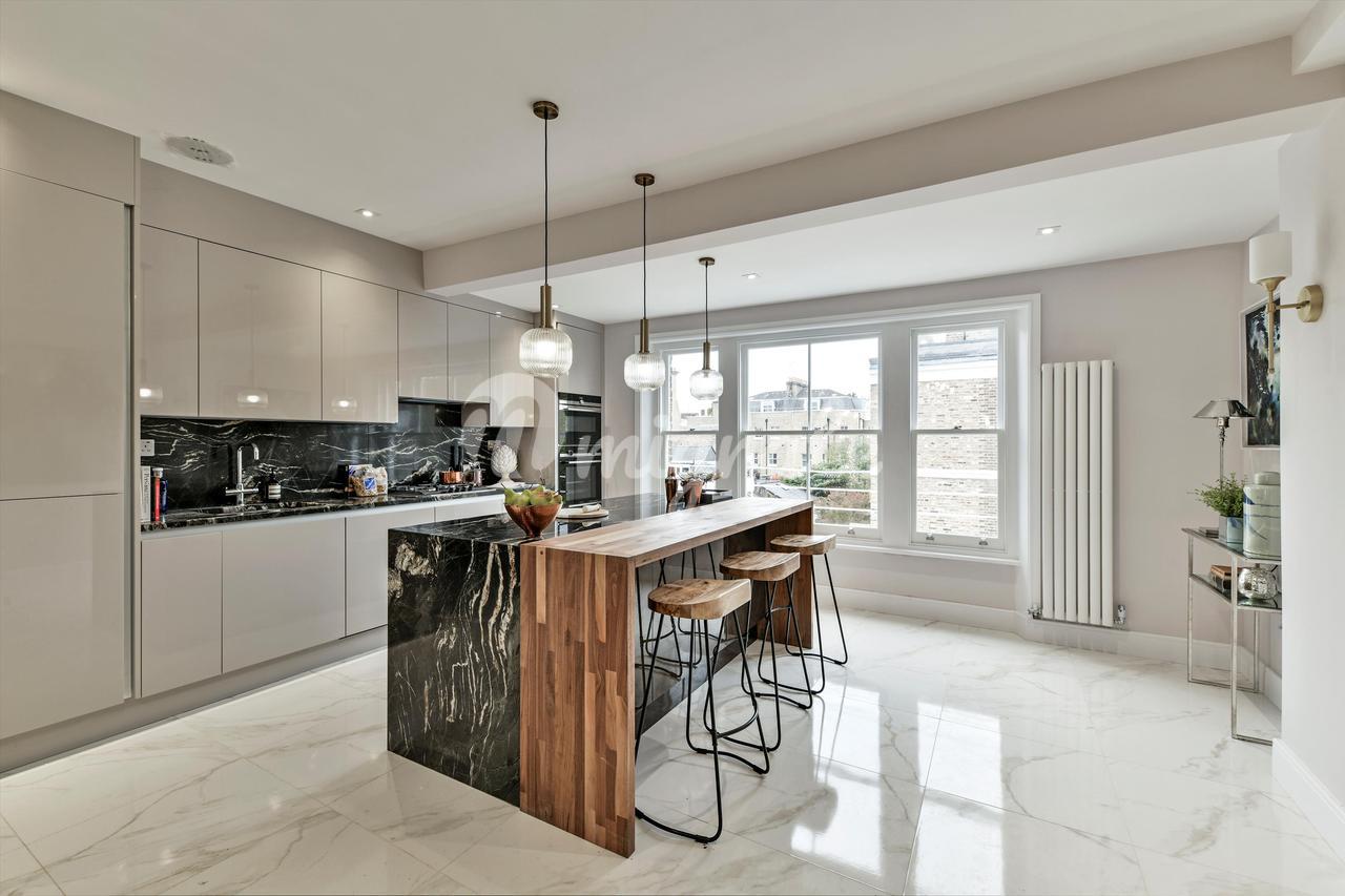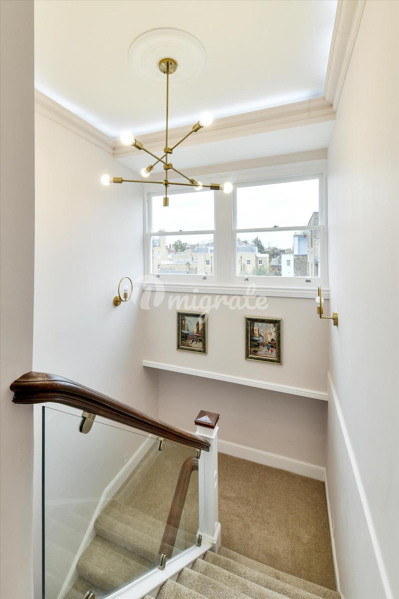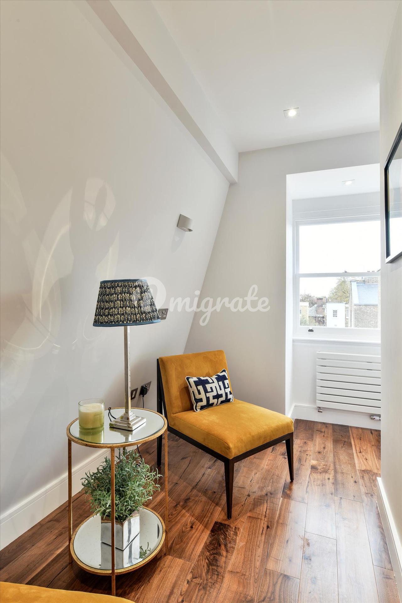 Эта квартира на втором и третьем этажах ведет через прихожую в приемную / столовую шириной 38 футов с прекрасным видом на Кенсингтон. На кухне установлена встроенная бытовая техника Siemens и кран с мгновенной подачей воды на 100 градусов. На втором этаже есть одна спальня, с ванной, и подсобное помещение, с туалетом. На третьем этаже расположены три спальни и дополнительное подсобное помещение. Две спальни имеют ванные комнаты. Это свойство было закончено по высоким стандартам с кондиционированием воздуха, полами с подогревом во всех ванных комнатах и новыми деревянными створчатыми окнами, обеспечивающими обилие естественного света. В собственности также есть общая терраса, выходящая на южную сторону для жителей, и длительный срок аренды.