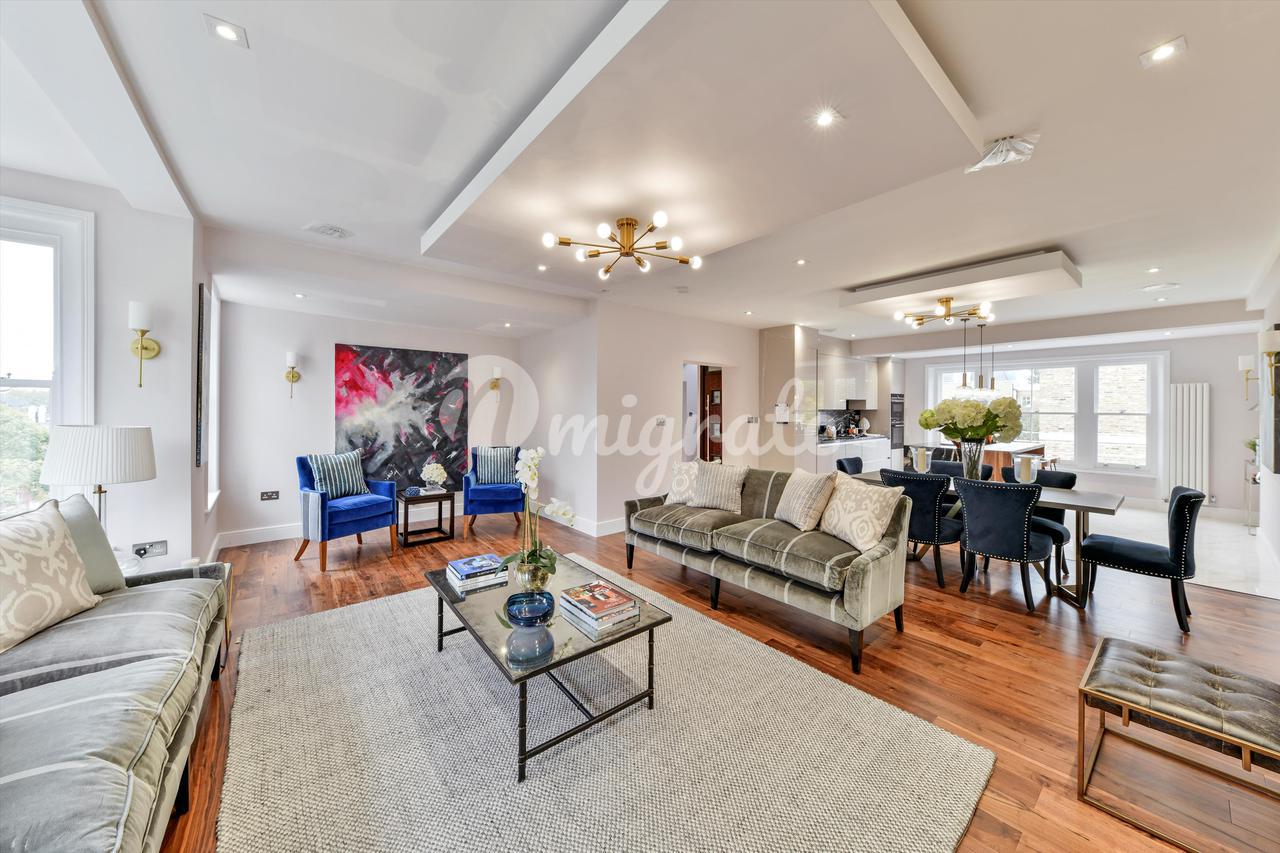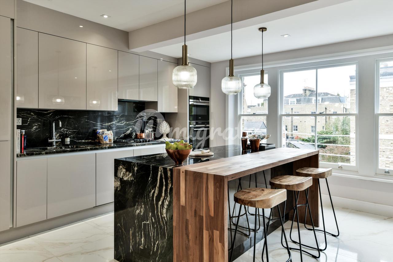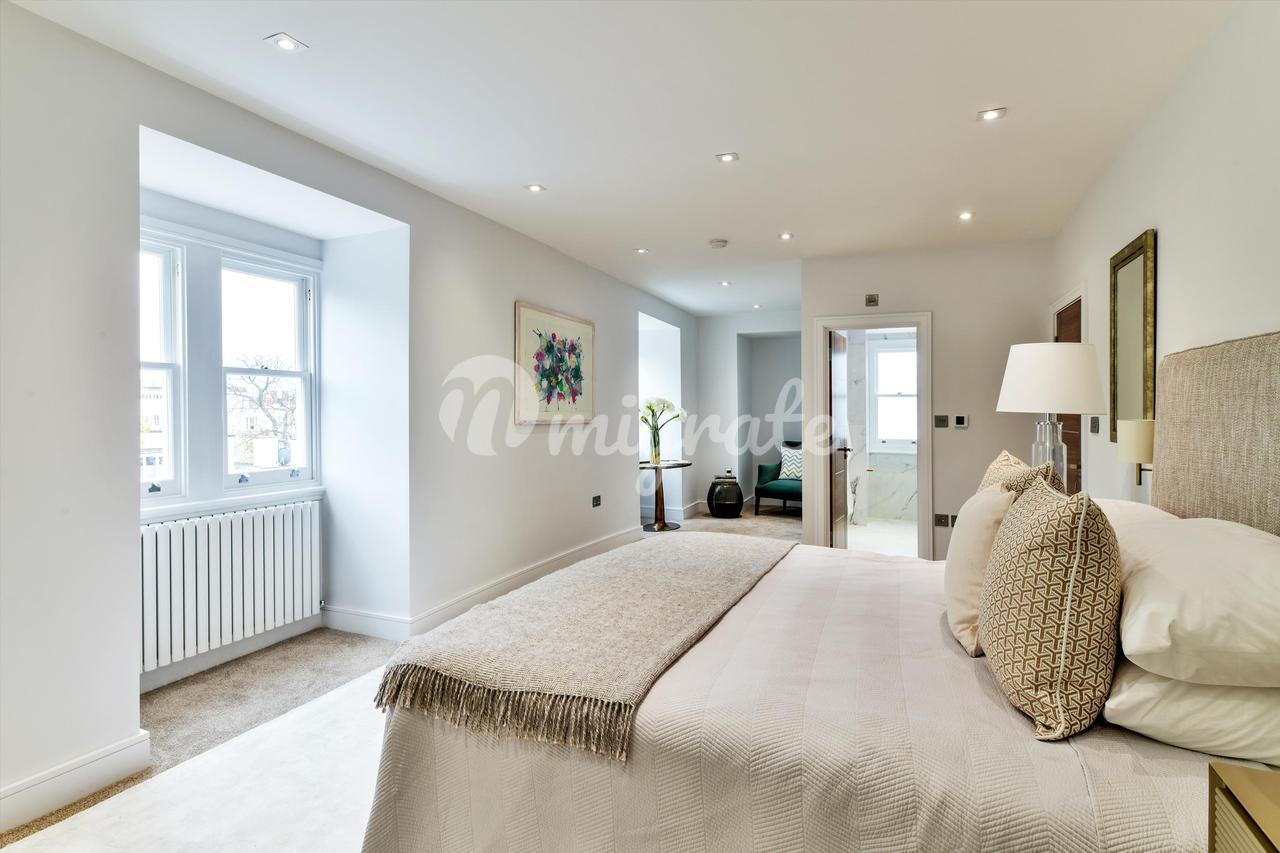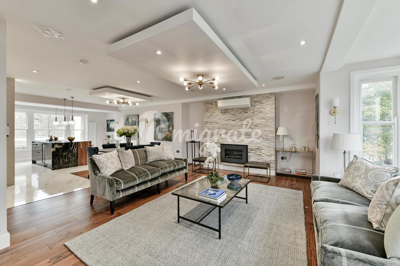 Эта квартира на втором и третьем этажах ведет через прихожую в приемную / столовую шириной 38 футов с прекрасным видом на Кенсингтон. На кухне установлена встроенная бытовая техника Siemens и кран с мгновенной подачей воды на 100 градусов. На втором этаже есть одна спальня, с ванной, и подсобное помещение, с туалетом. На третьем этаже расположены три спальни и дополнительное подсобное помещение. Две спальни имеют ванные комнаты. Это свойство было закончено по высоким стандартам с кондиционированием воздуха, полами с подогревом во всех ванных комнатах и новыми деревянными створчатыми окнами, обеспечивающими обилие естественного света. В собственности также есть общая терраса, выходящая на южную сторону для жителей, и длительный срок аренды.