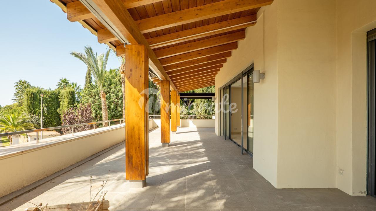 Терраса очень просторная, проходит по всей ширине дома, имеет как крытые, так и открытые участки и имеет прекрасный вид на море и сады. Две спальни имеют собственные ванные комнаты и прямой выход на террасу. В ванной комнате в главной спальне установлена гидромассажная ванна и душ.