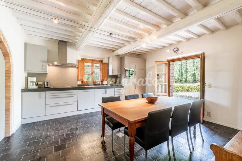 Недавно отремонтированная вилла, расположенная в тосканской коммуне Монтайоне, находится на участке площадью 13 га, основная часть этой площади используется под возделываемую землю с оливковыми деревь
