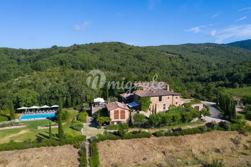 Поместье расположено в привилегированном панорамном месте в нескольких минутах ходьбы от центра города Радда-ин-Кьянти с очень красивыми видами. Поместье включает 3 здания с бассейном и 8 га земли. На