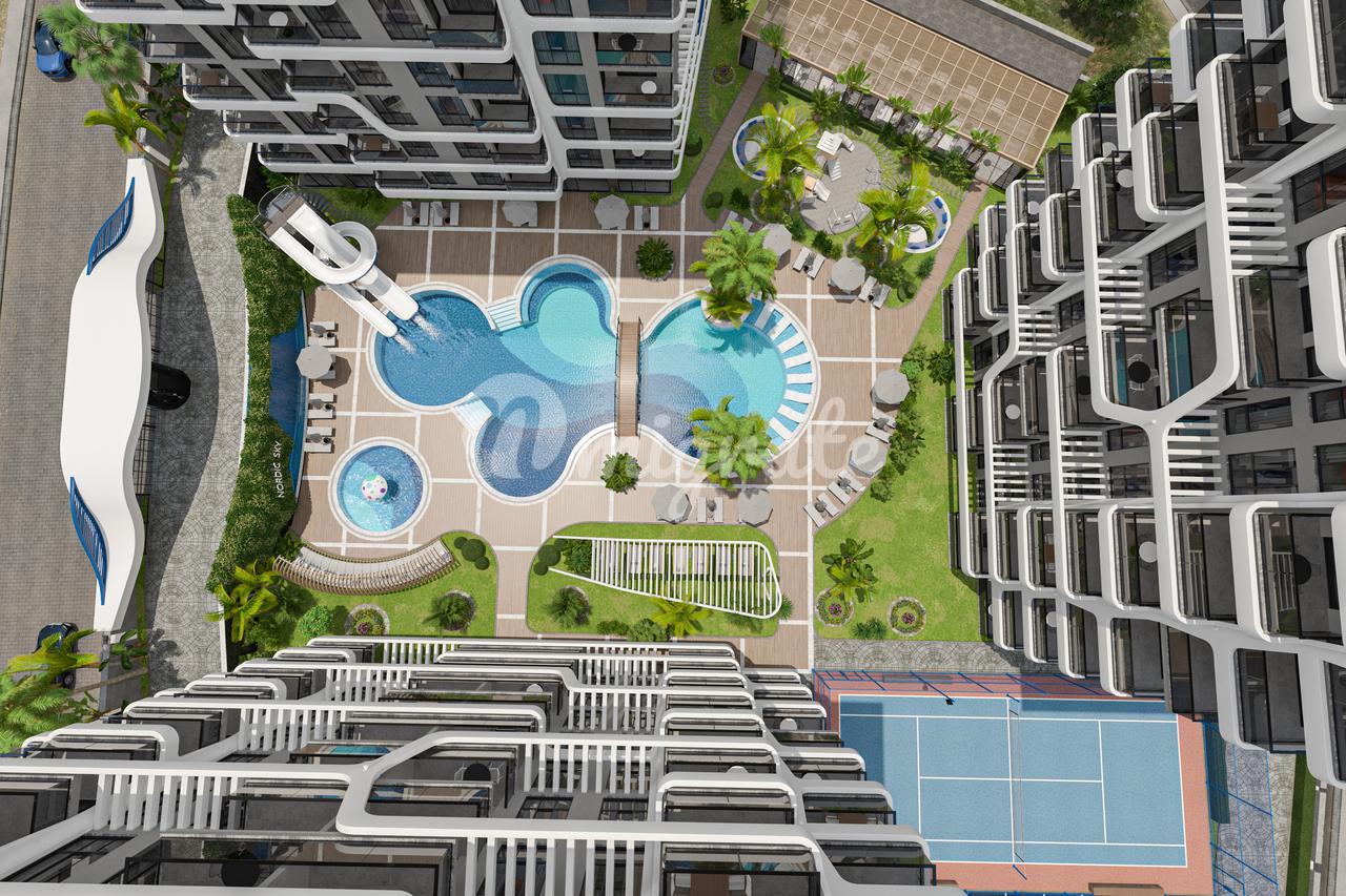 Яркий и современный жилой комплекс расположен в районе Тосмур, достаточно близком к центру Алании и, пр и этом, не таком шумном как центр города. Это изысканный проект класса люкс. Он отвечает запросам самых избирательных ценителей недвижимости на Аланийском побережье и отличается лаконичной архитектурой и комфортабельностью элитного пятизвездочного отеля. Жизнь в Тосмуре не останавливается ни на минуту, повсюду расположены супермаркеты, овощные, продуктовые и сувенирные лавки, аптеки, банкоматы, пекарни, а также другая необходимая инфраструктура. Этот комплекс имеет превосходную собственную инфраструктуру для отдыха и комфортабельного проживания: открытый бассейн с горками, детский бассейн, детская площадка, сад с ландшафтным дизайном и фонтанами, теннисный корт, открытые и крытые парковки, охрана и видеонаблюдение.