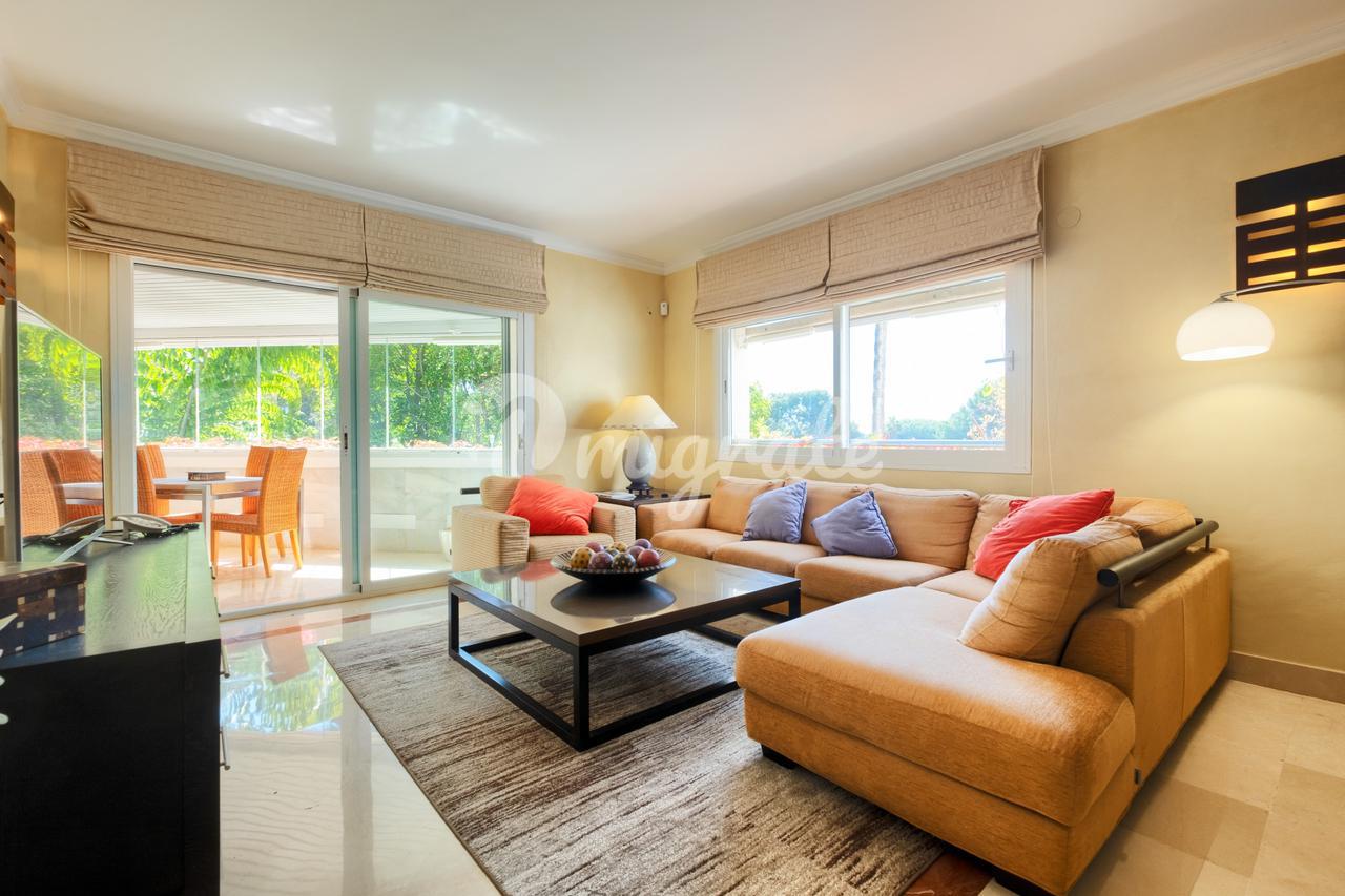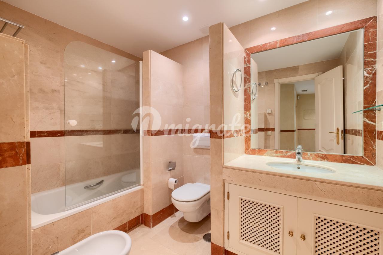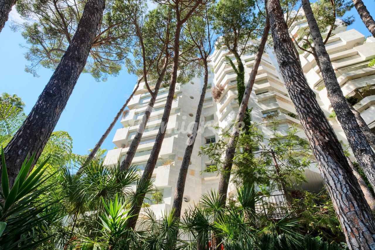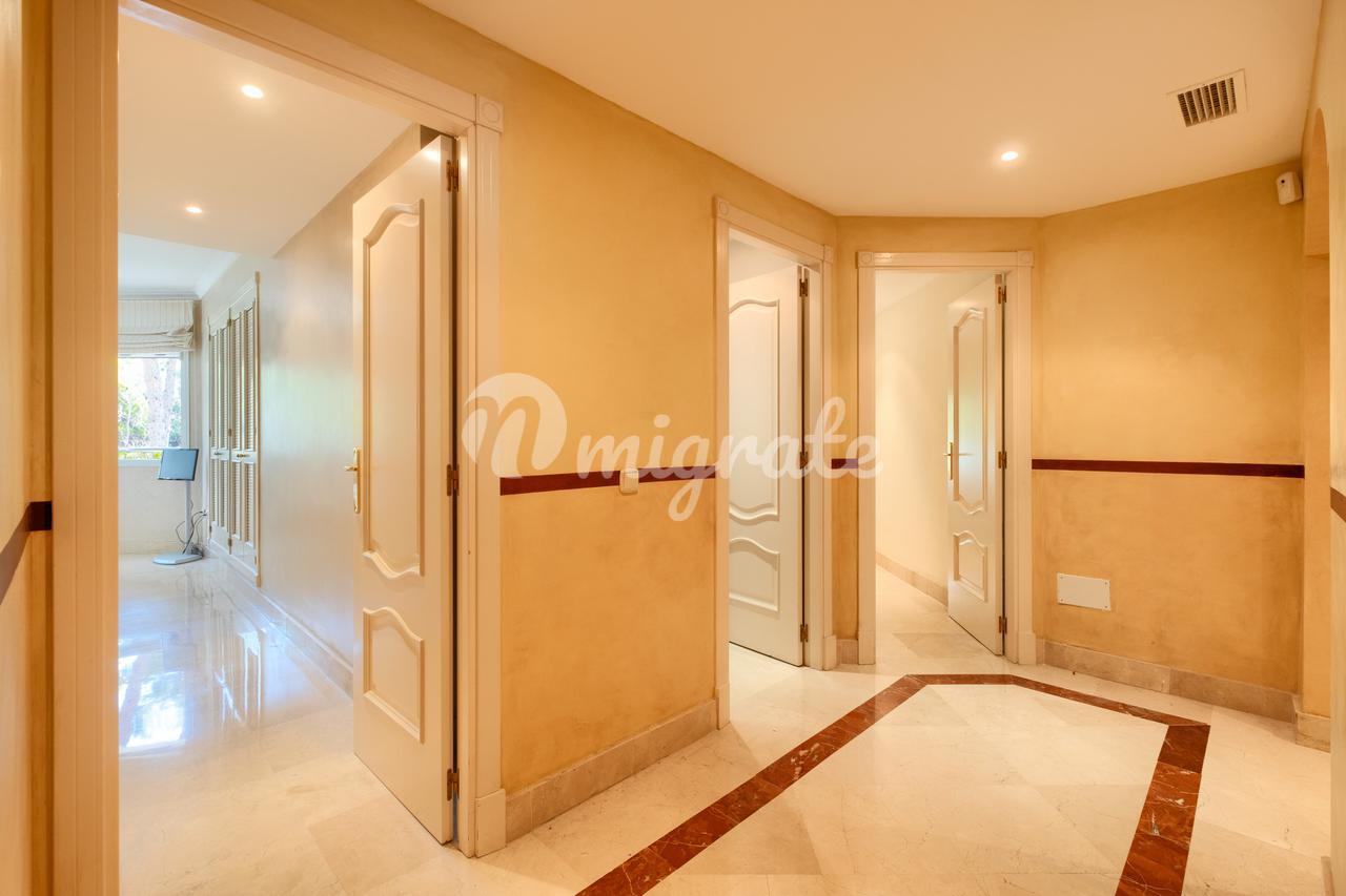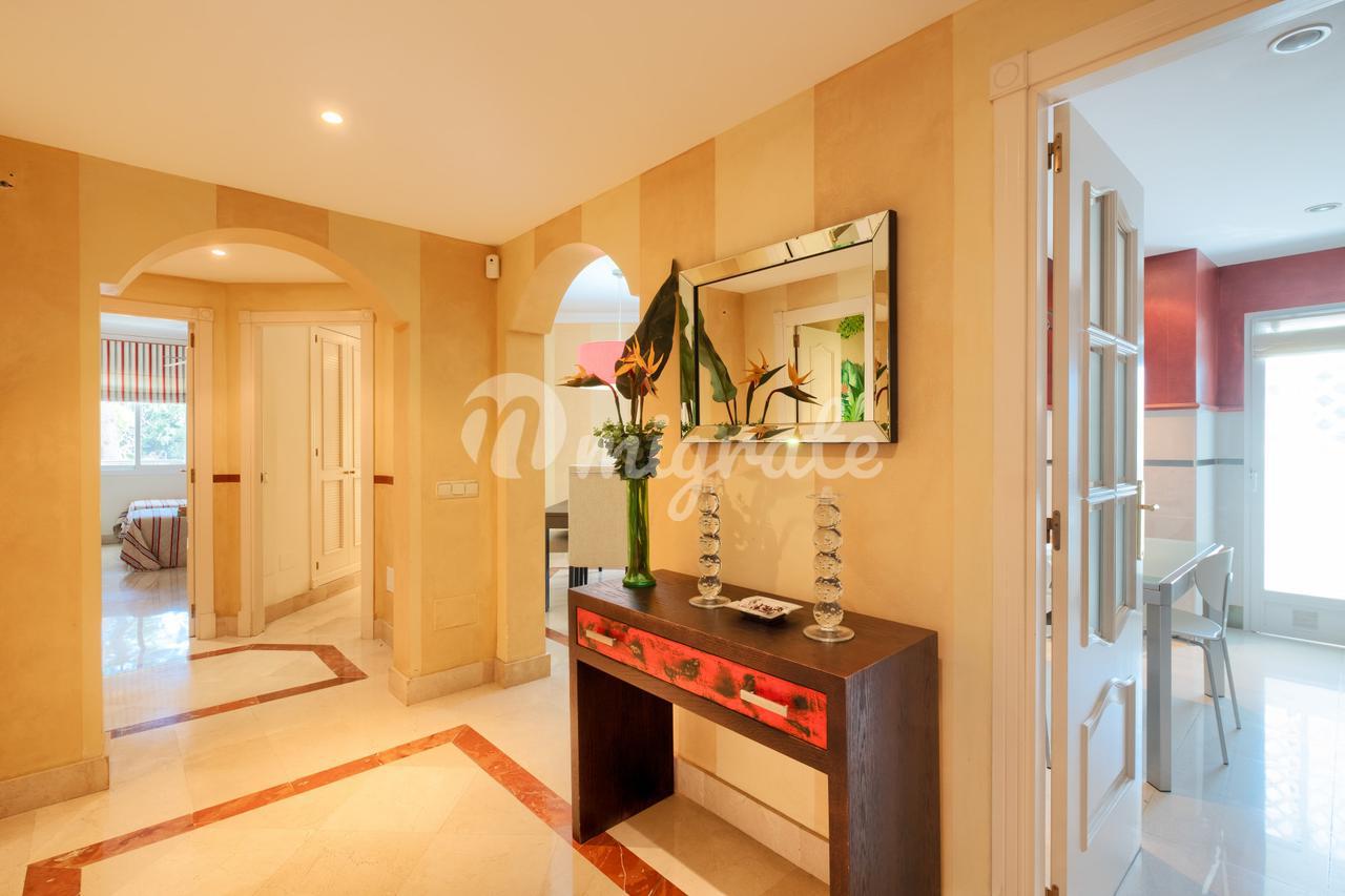 Пляжный комплекс под названием Jardines del Mediterraneo был построен в 2003 году с использованием высоких стандартов и высочайшего качества интерьеров. Он расположен всего в двух шагах от пляжа. Просторный общий холл с услугами консьержа и двумя лифтами, общий бассейн, большая гидромассажная ванна и сад с соснами добавляют ценность недвижимости. В нескольких минутах ходьбы от центра города Марбелья, магазинов, ресторанов, супермаркетов и услуг. Квартира на южной стороне имеет прихожую, гостевой туалет, гостиную/столовую с выходом на просторную застекленную террасу, общую с главной спальней. Есть еще две спальни, одна с ванной комнатой и одна с отдельной ванной комнатой. Во всех ванных комнатах есть ванна, кроме основной, в которой дополнительно есть душевая кабина. Полностью оборудованная кухня оборудована бытовой техникой Bosch и имеет прилегающую прачечную. Кроме того, квартира может похвастаться подогревом полов в ванных комнатах, кондиционером с тепловым насосом, мраморными полами, а также гаражом и кладовой.