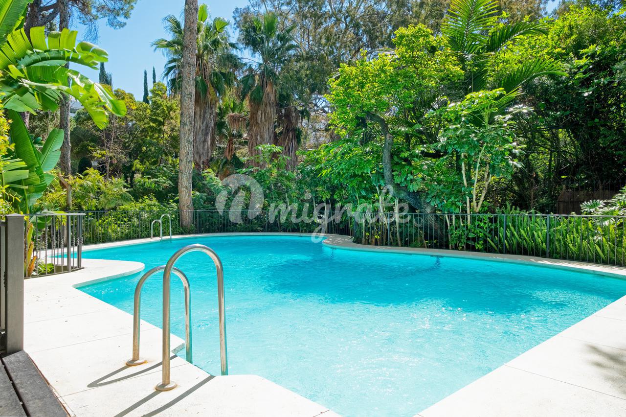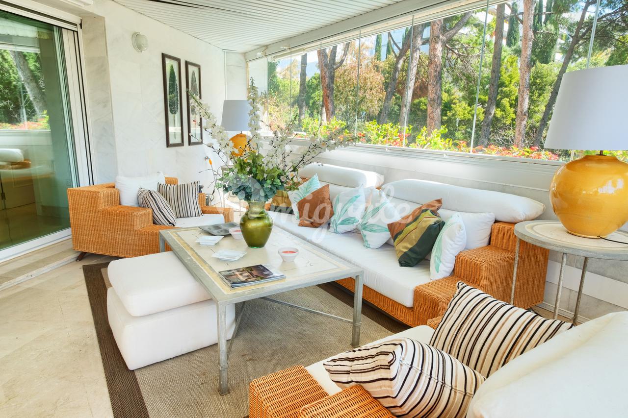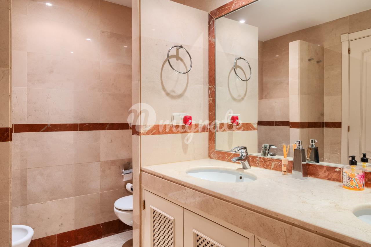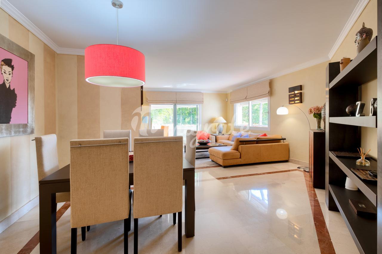 Пляжный комплекс под названием Jardines del Mediterraneo был построен в 2003 году с использованием высоких стандартов и высочайшего качества интерьеров. Он расположен всего в двух шагах от пляжа. Просторный общий холл с услугами консьержа и двумя лифтами, общий бассейн, большая гидромассажная ванна и сад с соснами добавляют ценность недвижимости. В нескольких минутах ходьбы от центра города Марбелья, магазинов, ресторанов, супермаркетов и услуг. Квартира на южной стороне имеет прихожую, гостевой туалет, гостиную/столовую с выходом на просторную застекленную террасу, общую с главной спальней. Есть еще две спальни, одна с ванной комнатой и одна с отдельной ванной комнатой. Во всех ванных комнатах есть ванна, кроме основной, в которой дополнительно есть душевая кабина. Полностью оборудованная кухня оборудована бытовой техникой Bosch и имеет прилегающую прачечную. Кроме того, квартира может похвастаться подогревом полов в ванных комнатах, кондиционером с тепловым насосом, мраморными полами, а также гаражом и кладовой.