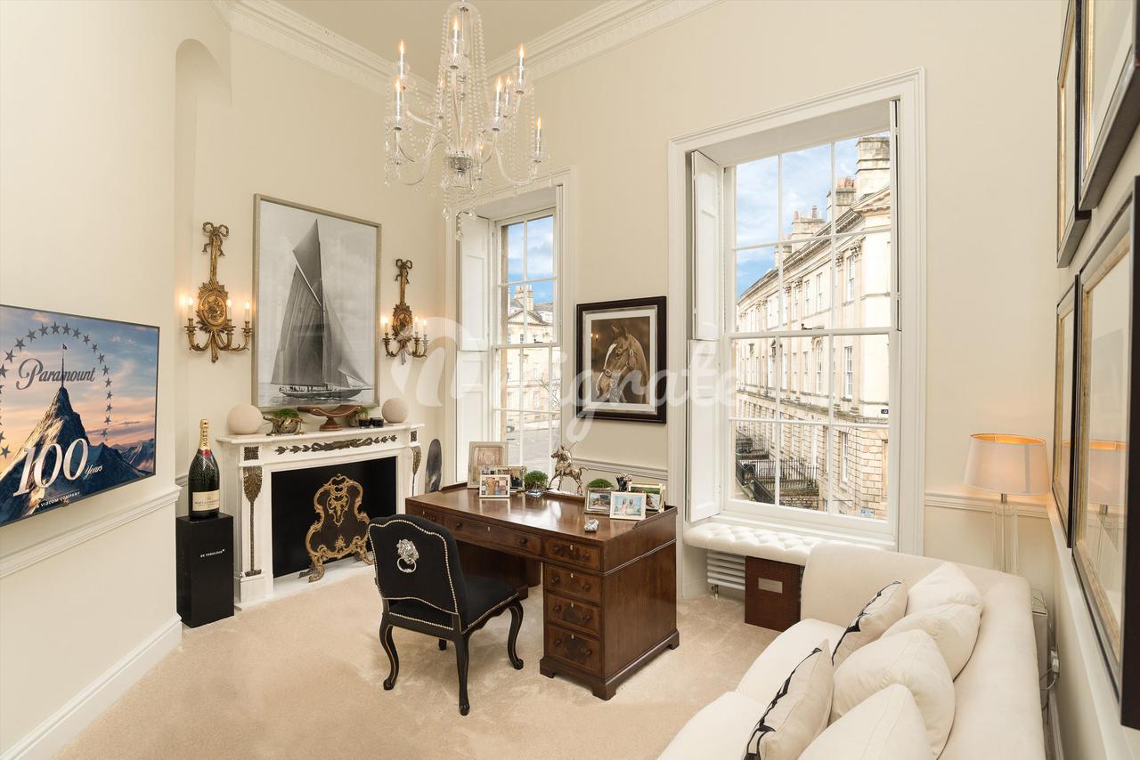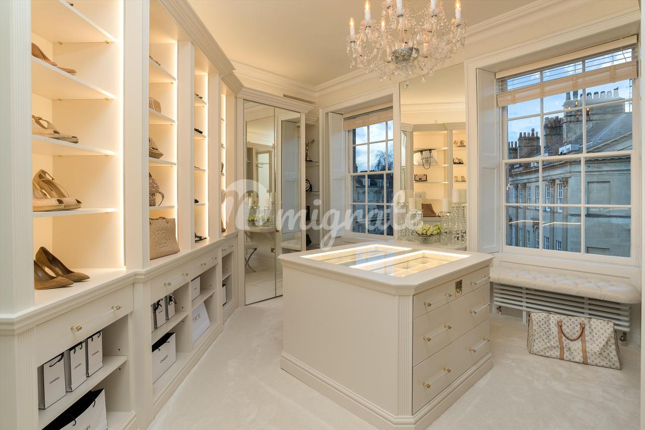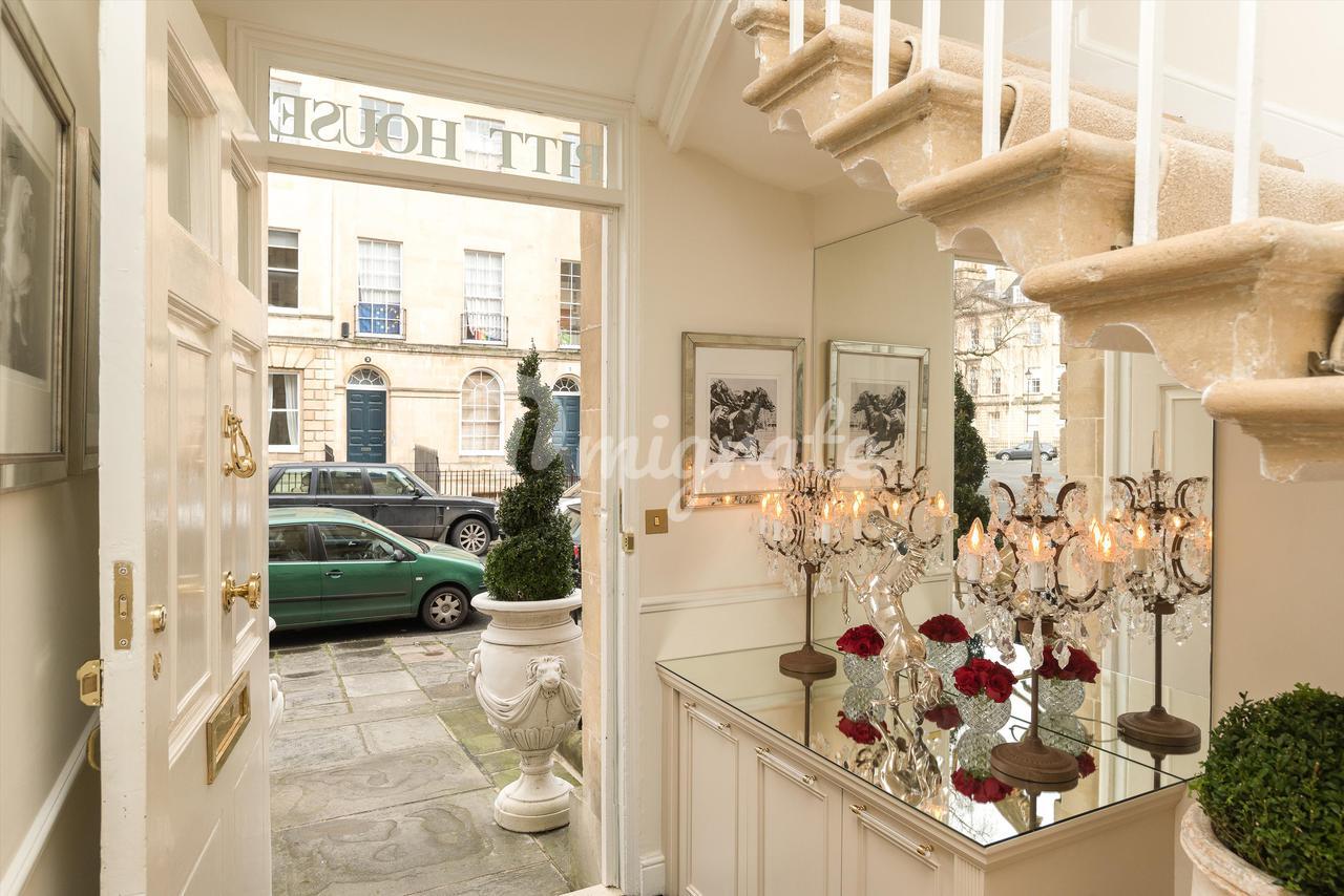 Дом Питта был построен в 1792 году по проекту Томаса Болдуина как часть поместья Палтни. В 1802 году здесь жил премьер-министр Великобритании Уильям Питт (эту деталь подтверждает бронзовая табличка на фасаде дома). Сегодня этот впечатляющий дом в георгианском стиле с двойным фасадом был капитально отремонтирован, чтобы создать роскошную семейную резиденцию с пятью спальнями на пяти этажах. Многие оригинальные элементы сохранились, в том числе великолепная консольная лестница, оконные ставни, декоративный карниз, исключительная высота потолков, высокие окна со створками и старинные камины. Повсюду оформлен в мягких, нейтральных тонах, вся сантехника и фурнитура высочайшего качества: например, двухворсовые ковры и отреставрированные деревянные полы, шкафы ручной работы из дуба во всех спальнях, сделанные на заказ сиденья у окна (изготовлены обойщиками Aston Martin). ), традиционные латунные ручки, шелковые шторы, электрические жалюзи и французские и итальянские хрустальные люстры. На первом этаже вас встречает светлая, элегантная прихожая; Лестницы и коридоры на всех этажах светлые и светлые, естественно освещенные световым люком на верхнем этаже. Справа находится кабинет (или гардеробная, если хотите) с элегантным камином и светящимися бра, вместительными встроенными шкафами для верхней одежды и окнами с видом на Лора-плейс и Грейт-Пултени-стрит. Также на этом этаже сделанная на заказ кухня, построенная Клейтоном Дэвидсоном, имеет окна, выходящие на задний двор, каменные столешницы и остров из орехового дерева с изогнутыми банкетными креслами и круглым столом для завтрака. Есть достаточно бытовой техники, в том числе 2 духовки Miele, 2 холодильника с морозильной камерой и 2 посудомоечные машины, а также встроенный холодильник для вина, микроволновая печь и кофеварка, а также кладовая, ящики для специй и витрины. Прилегающая столовая достаточно просторна для 12-местного стола. На первом этаже элегантная жилая площадь разделена на две смежные комнаты с большими пропорциями: одна в передней части дома, с высокими окнами, камином и 75-дюймовым телевизором; а другой с прекрасным видом на знаменитую плотину Бата, отель Empire и Parade Gardens. Через холл есть второй кабинет (или спальня). Наверху главная спальня занимает весь второй этаж: здесь есть спальня, роскошная ванная комната с отдельно стоящей ванной в центре, душевая кабина, две раковины и герметичные деревянные полы. Шикарная гардеробная со встроенными шкафами, полками с подсветкой, туалетным столиком и островной витриной завершает комплект.