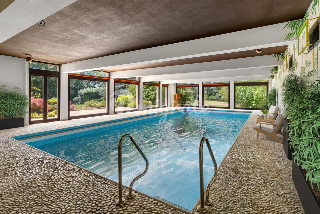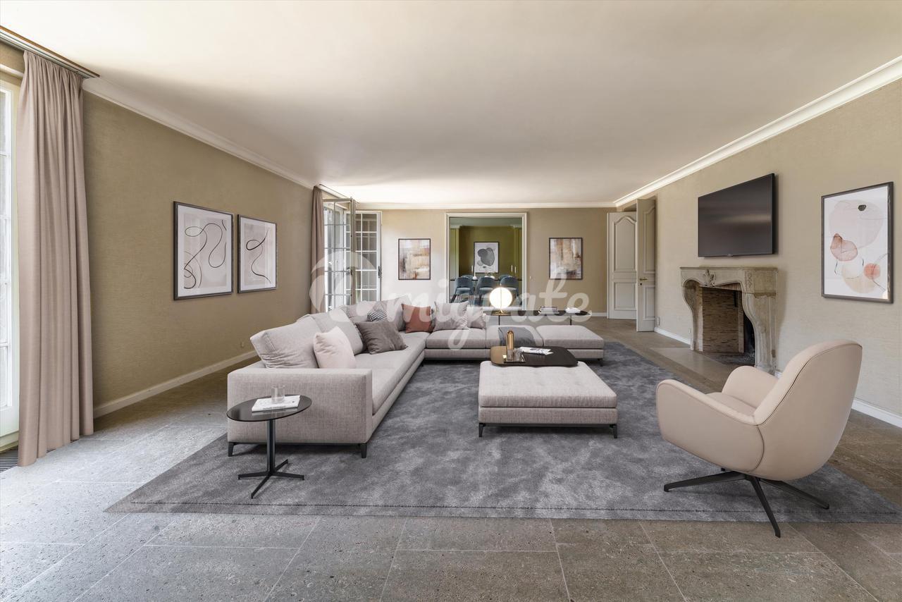 На первом этаже этого дома находится прихожая с гардеробной, 3 гостевых туалета, спальня и библиотека. В доме есть светлая большая гостиная с примыкающей столовой, оборудованная кухня и подсобное помещение. К услугам гостей эксклюзивный крытый бассейн с сауной, веранда с камином и гараж на две машины. Завершает этот этаж квартира-студия с мини-кухней. На втором этаже дома находится главная спальня с гардеробной, еще одна гостиная, 6 спален и 5 ванных комнат. В мезонине находится еще одна гостиная с мини-кухней.
