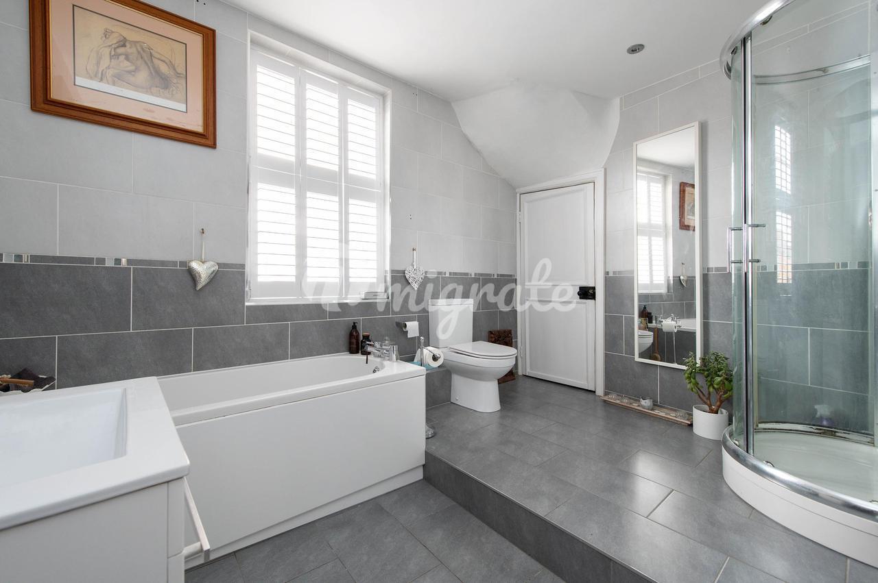 Светлая и просторная лестничная площадка первого этажа с большим створчатым окном обеспечивает доступ к спальне с двуспальной кроватью и прилегающим туалетом. Коридор продолжается до внутренней посадочной площадки. Недавно переоборудованная главная спальня с камином в стиле Адама, выступающими балками и створчатым окном с видом на заднюю часть дома. Семейная ванная комната, полностью выложенная плиткой, оснащена белой сантехникой, ванной, душем и раковиной с туалетным столиком внизу.