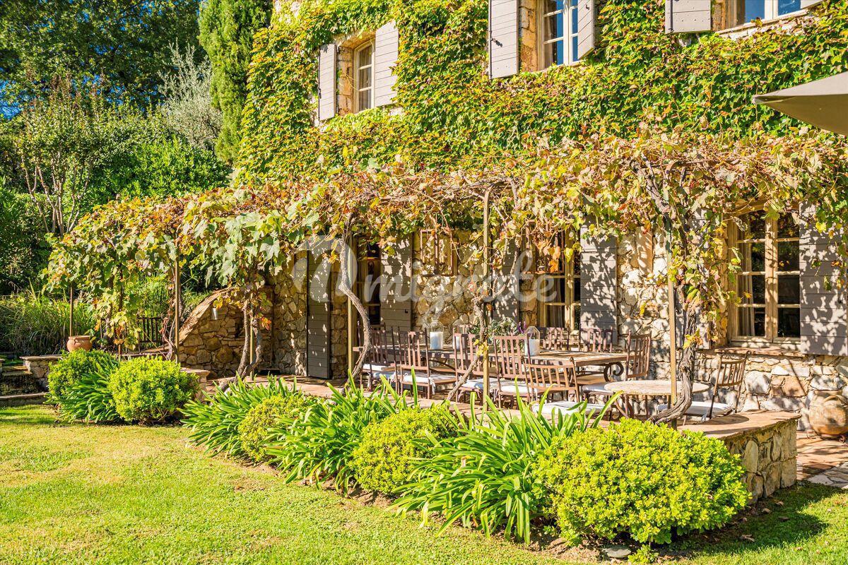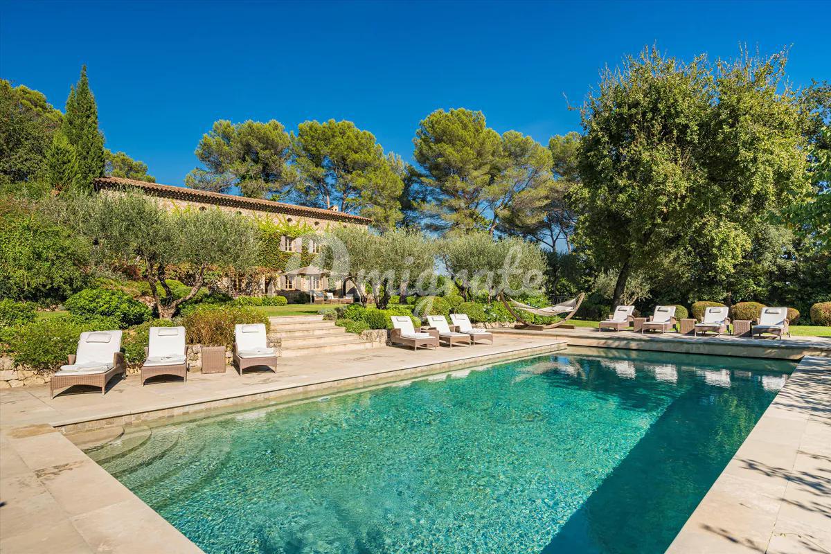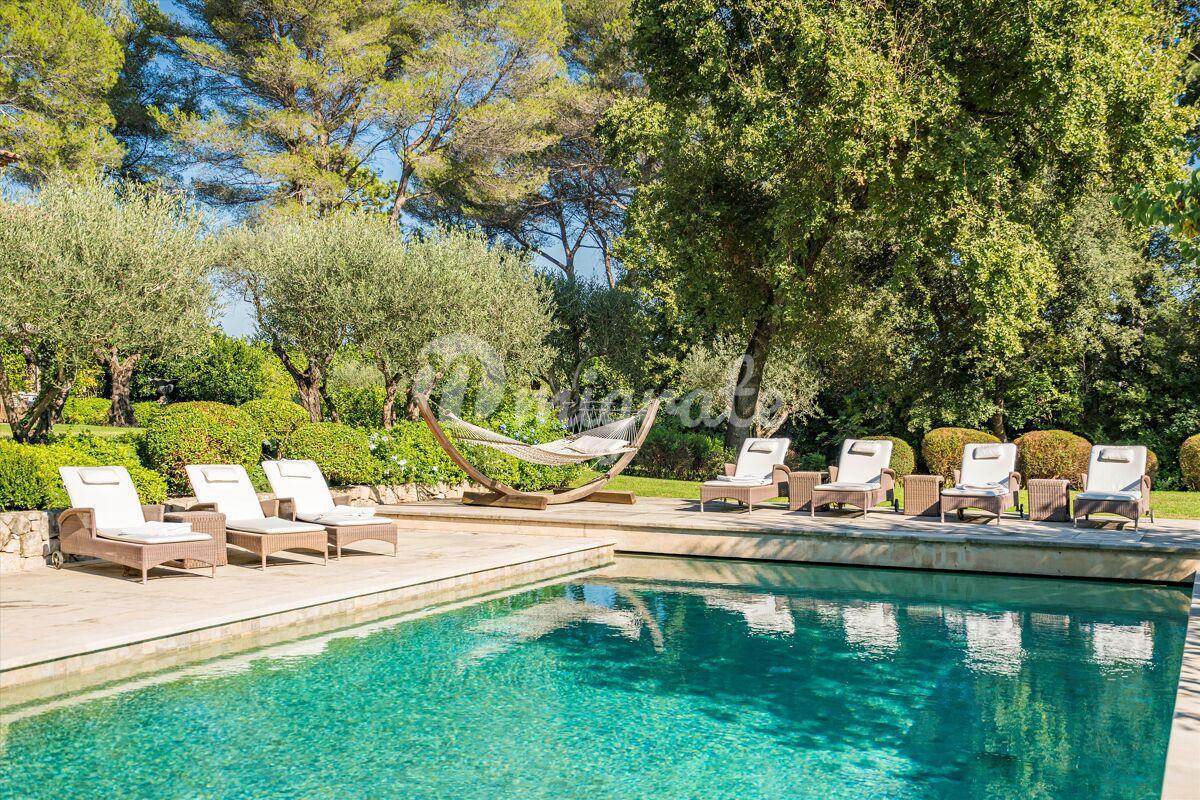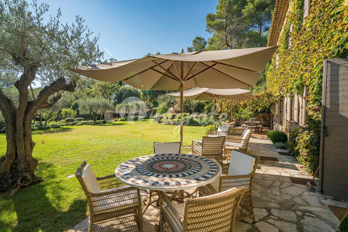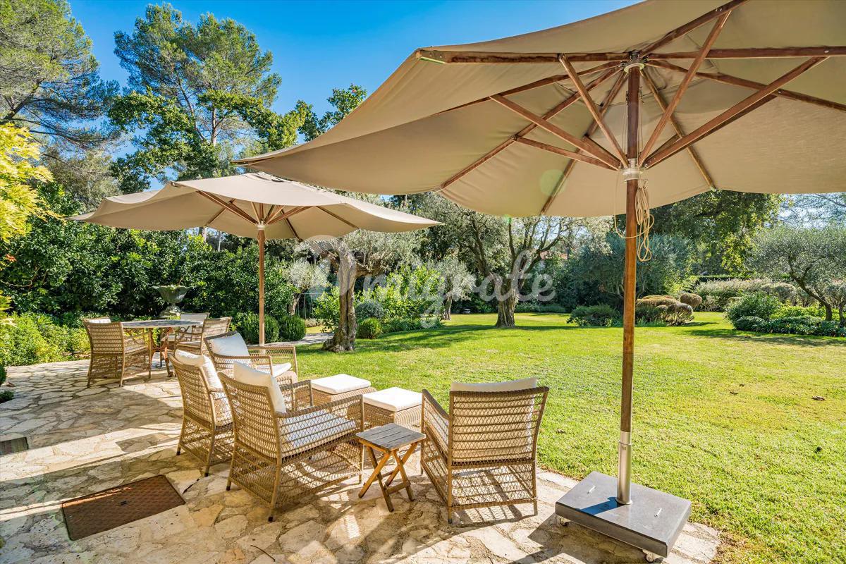 Вилла расположена на территории площадью 3470 кв. м с ландшафтными провансальскими садами с множеством оливковых и фруктовых деревьев, скульптурных кустарников. На территории есть подогреваемый бассейн и домик у бассейна с гостиной, кухней, обеденной зоной, ванной и постирочной комнатой. Для размещения автомобилей есть паркинг с навесом на 2 места, гараж на 4 места и дополнительное место на улице для 6+ автомобилей.