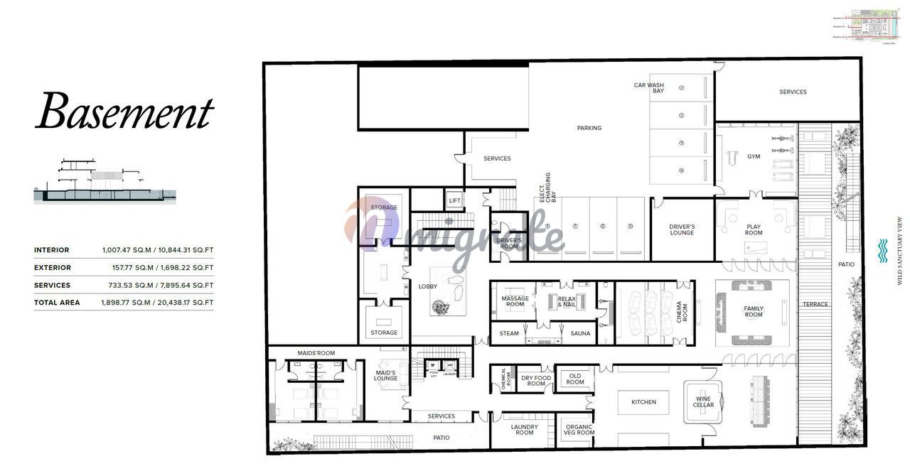 • Цокольный уровень (B) включает террасу, семейную гостиную, тренажерный зал, спа-салон, кинотеатр и гараж для парковки.