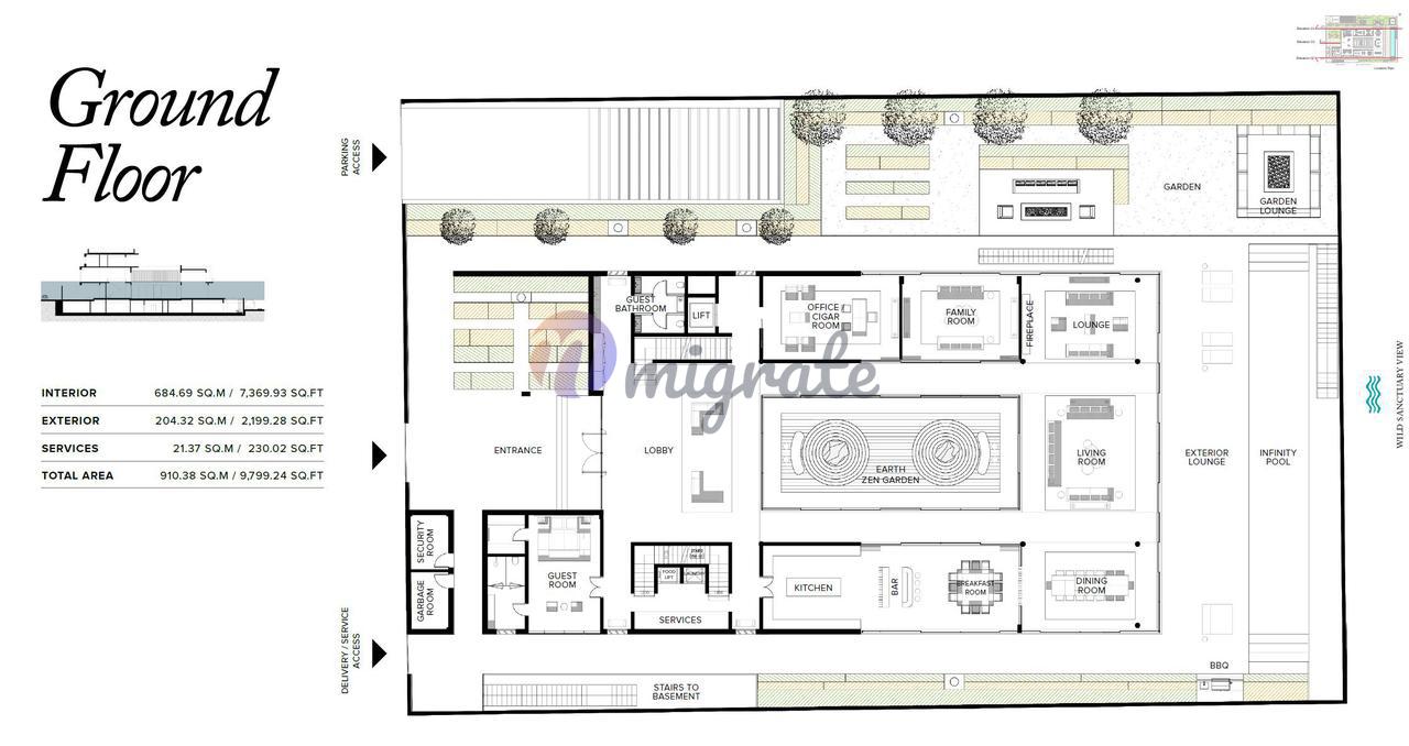 • На уровне внутреннего дворика (GF) расположены основные жилые помещения/приемная и бассейн.