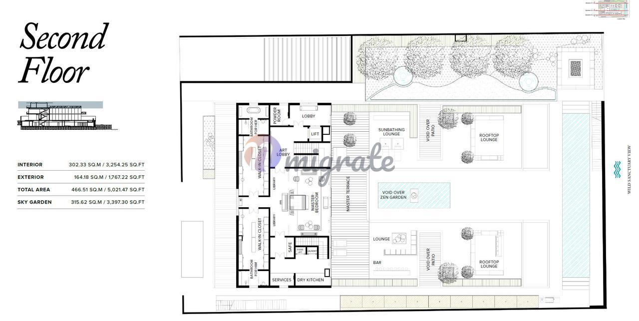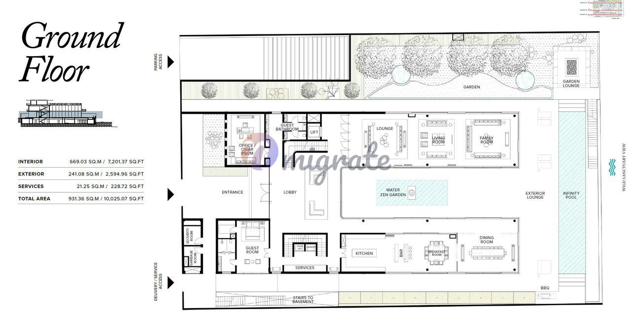 • На уровне внутреннего дворика (GF) расположены основные жилые помещения/помещения для приемов и бассейн.
