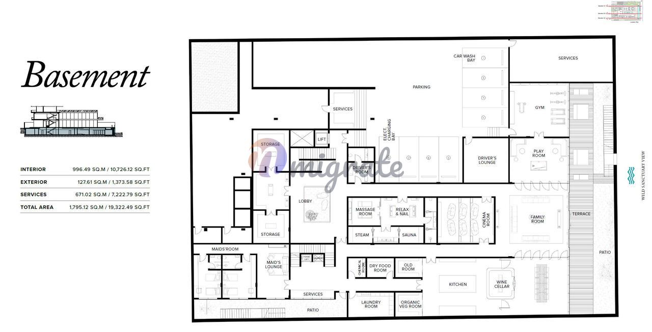 • Цокольный уровень (B) включает в себя террасу, семейную гостиную, тренажерный зал, спа-салон, кинотеатр и гараж.