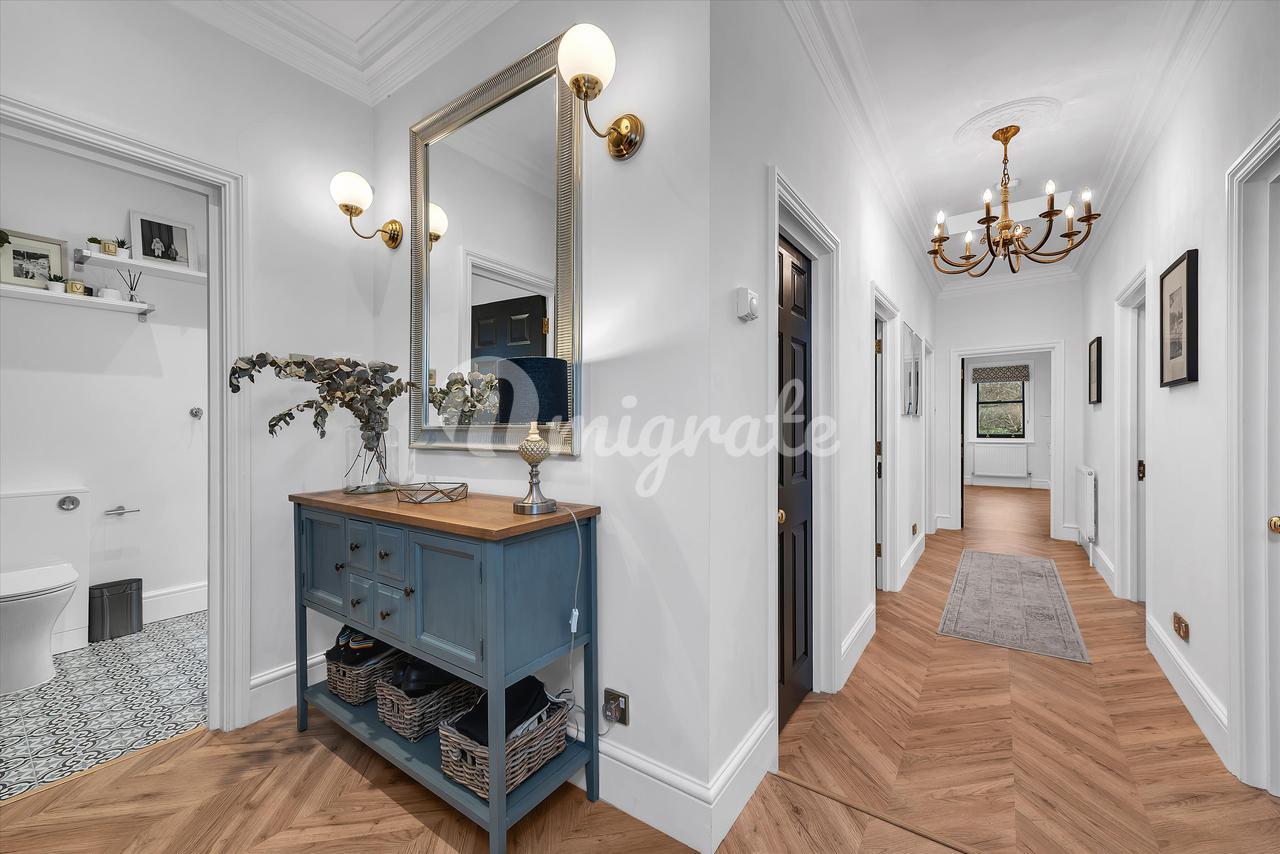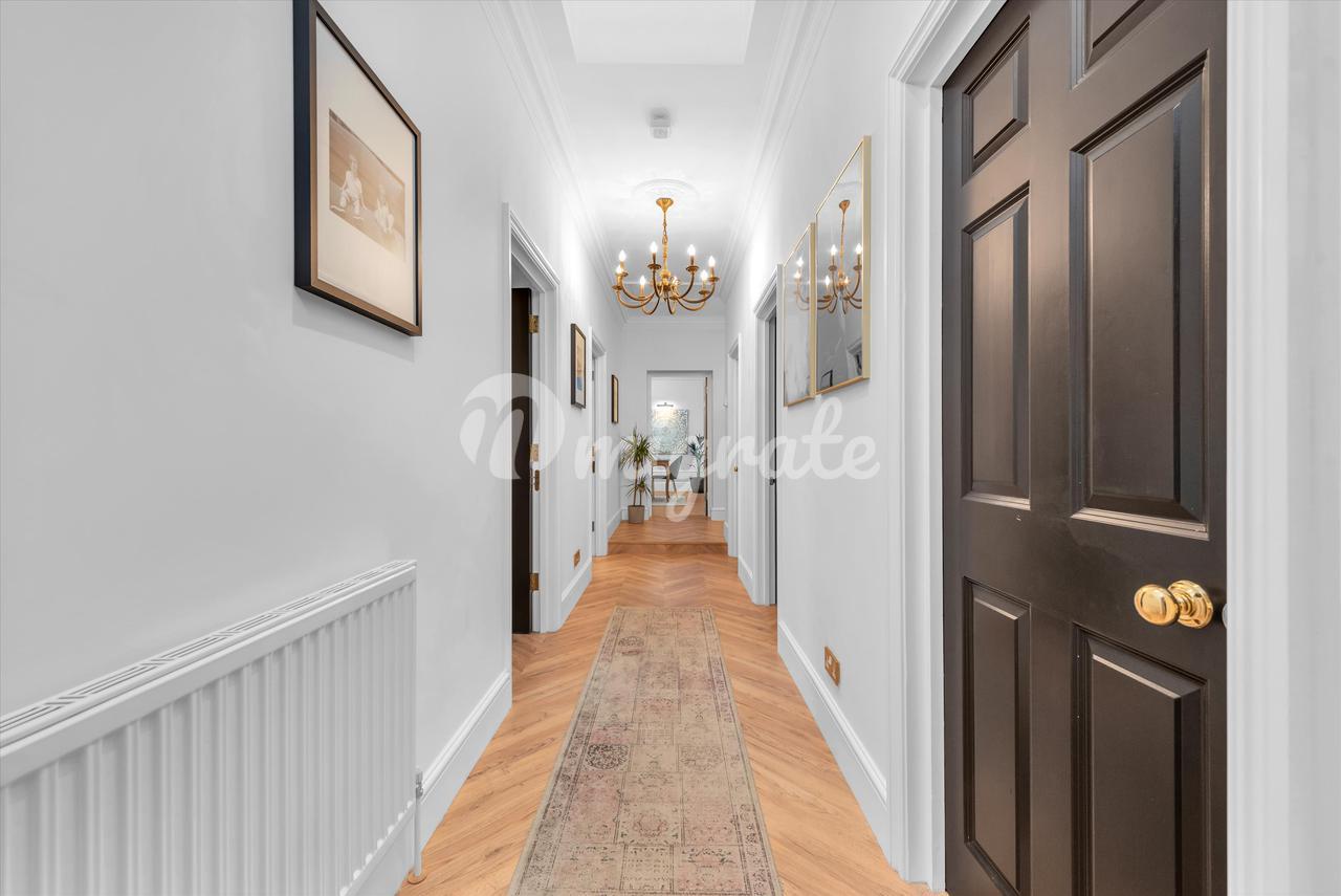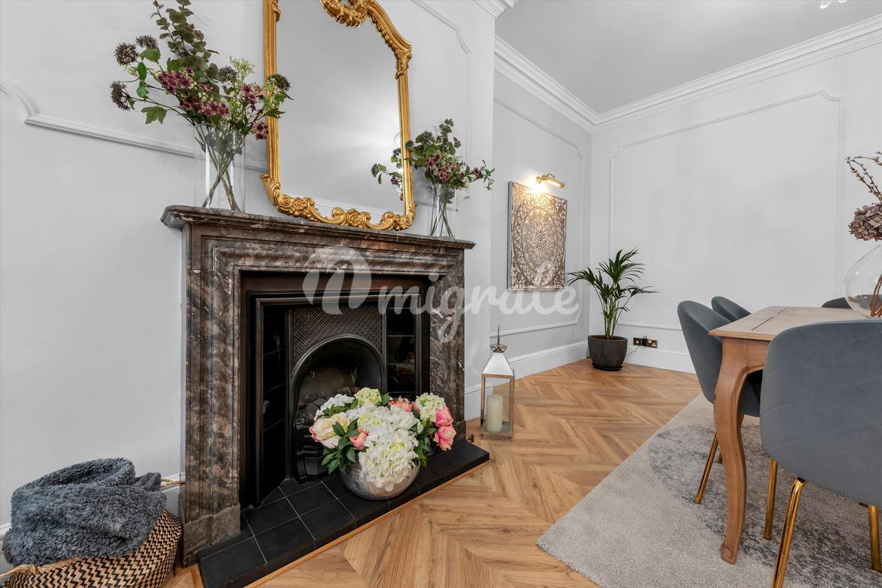 Квартира сочетает в себе старинный стиль с современной эстетикой благодаря ламинированному полу в елочку и со вкусом оформлена традиционными панелями. В коридоре есть функциональное хранилище, а также семейная / гостевая ванная комната. Квартира ведет в просторную гостиную с потрясающим камином с мраморной окантовкой и видом на коммунальные сады и окрестности. Кухня выходит из гостиной с полуоткрытой планировкой. Кухня была стильно оформлена со шкафами в стиле шейкер и имеет остров с раковиной дворецкого и кварцевыми рабочими поверхностями.