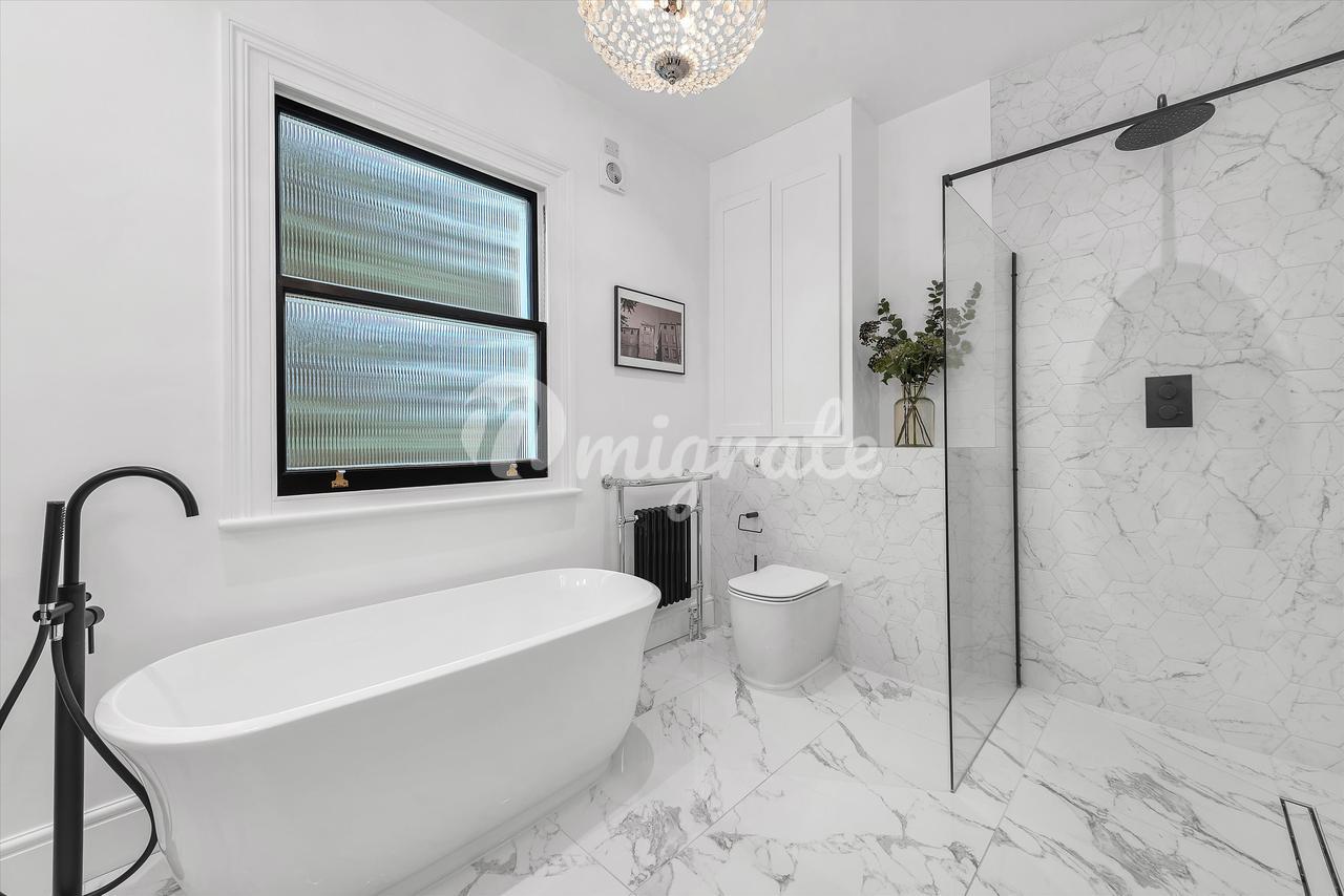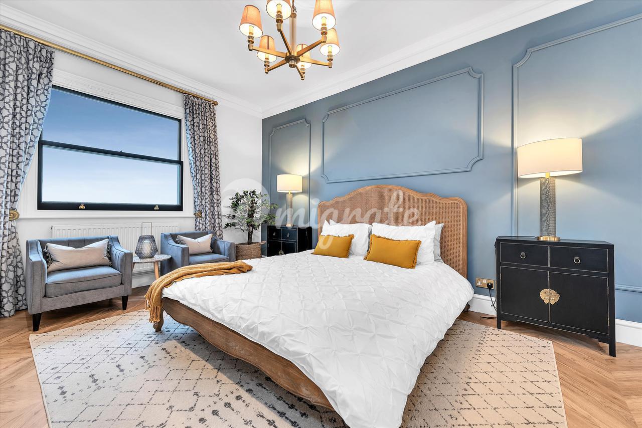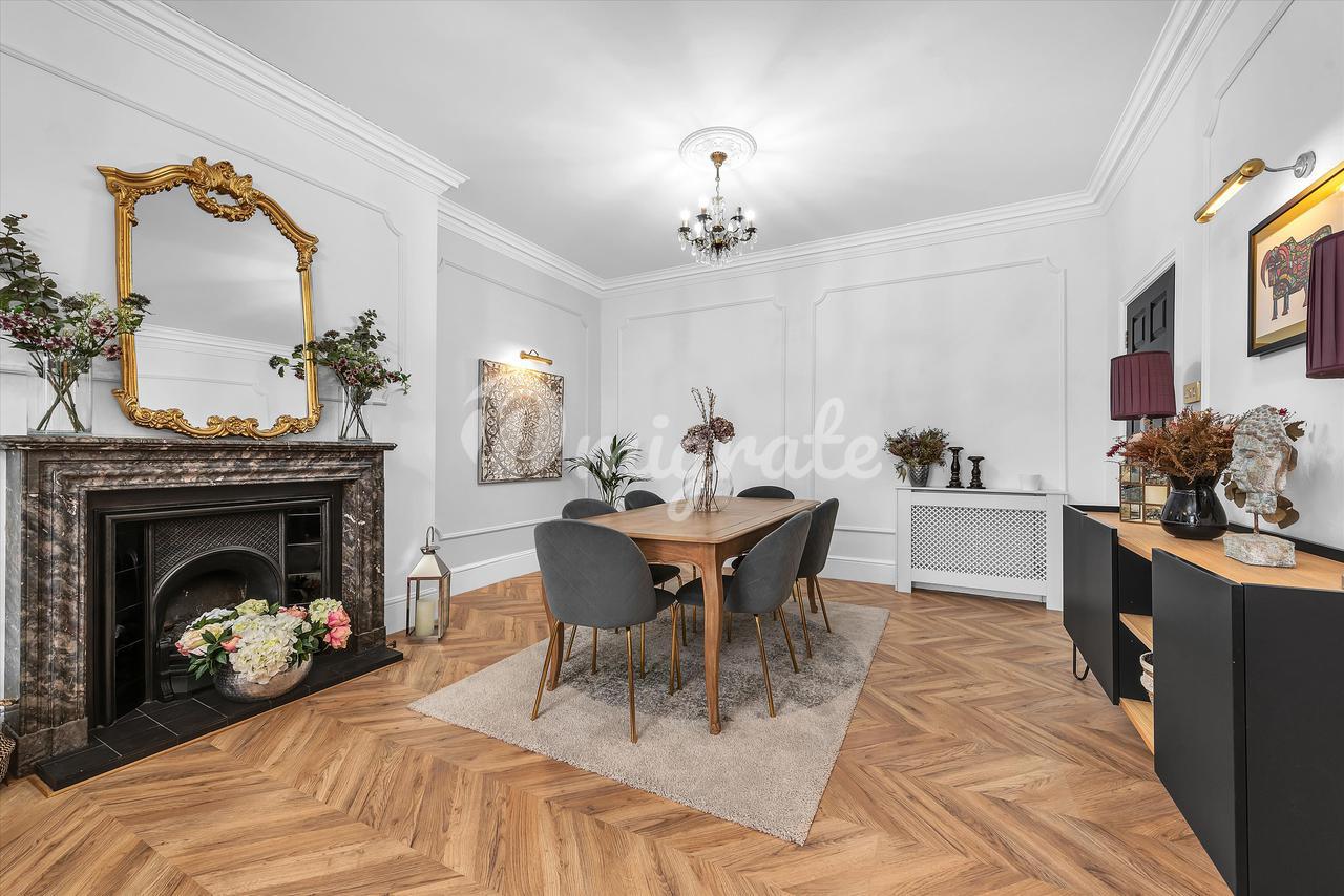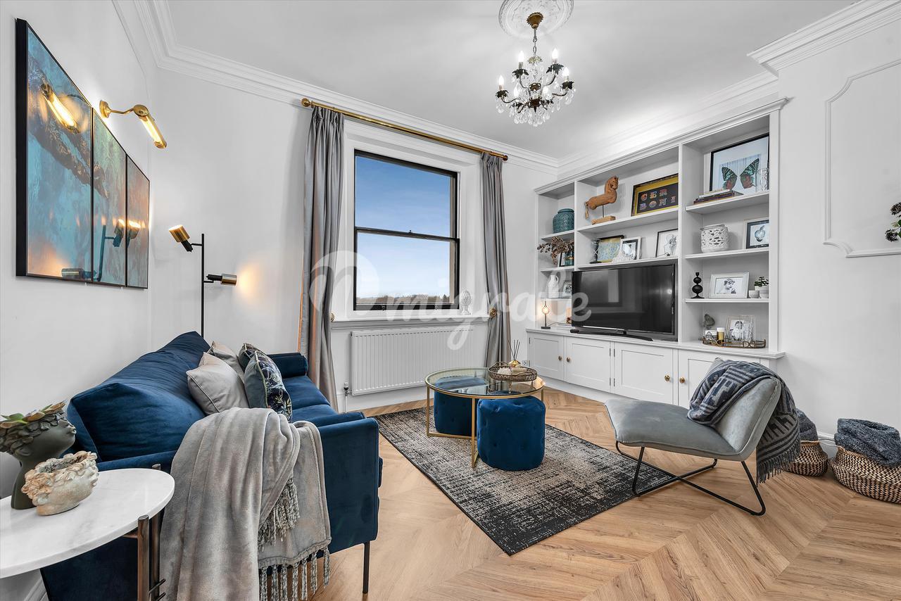 Квартира сочетает в себе старинный стиль с современной эстетикой благодаря ламинированному полу в елочку и со вкусом оформлена традиционными панелями. В коридоре есть функциональное хранилище, а также семейная / гостевая ванная комната. Квартира ведет в просторную гостиную с потрясающим камином с мраморной окантовкой и видом на коммунальные сады и окрестности. Кухня выходит из гостиной с полуоткрытой планировкой. Кухня была стильно оформлена со шкафами в стиле шейкер и имеет остров с раковиной дворецкого и кварцевыми рабочими поверхностями.