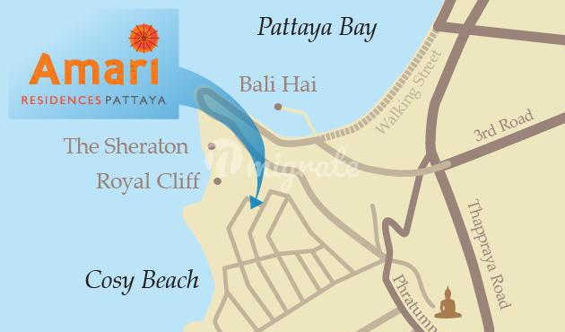 Amari Residences Pattaya - современный комплекс располагается в престижном районе Пратамнак в шаговой доступности до пляжа Cosy beach. Комплекс имеет очень удобное расположение, в округе прекрасная инфраструктура: в пешей доступности минимаркеты, кафе, рестораны, рынки и огромный выбор развлечений. Рядом находятся известные достепримечательности: смотровая площадка, храм Золотого Будды и парк Рамы IX.