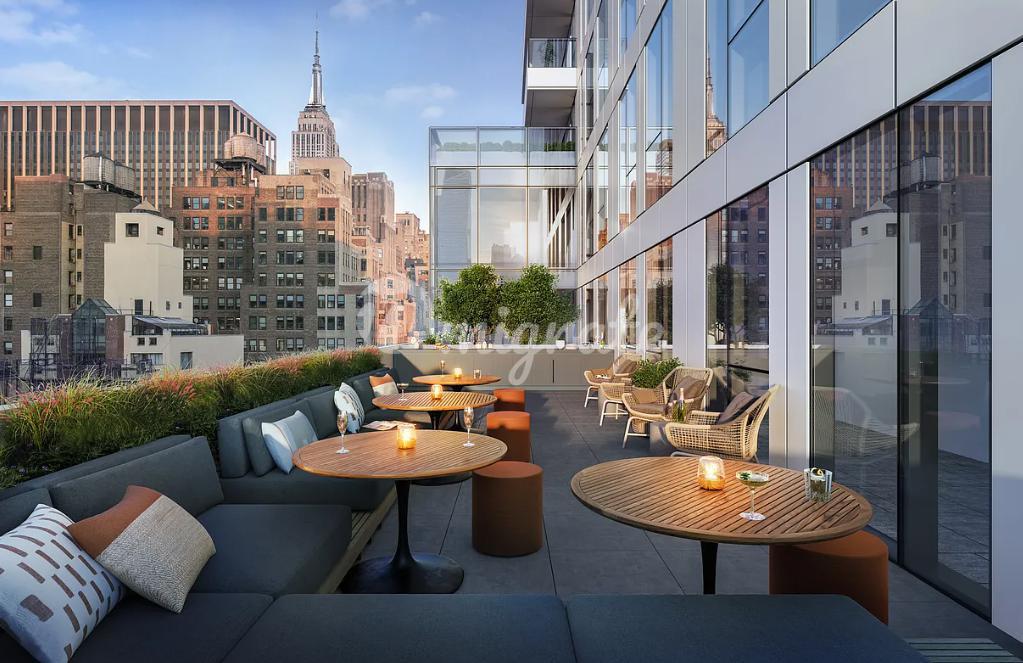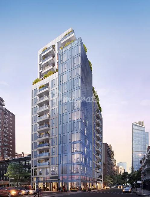 В числе удобств - круглосуточно посещаемое лобби, озелененный открытый двор на 2 этаже с грилями, терраса на 12 этаже с впечатляющим видом на город от Гудзон Ярдс до Эмпайр Стейт Билдинг, элегантный тренажерный зал с естественным освещением, лаундж и пространство для совместной работы с комнатами, которые можно разделить для уединения или расширить для развлечений, а также кладовая для частных мероприятий.