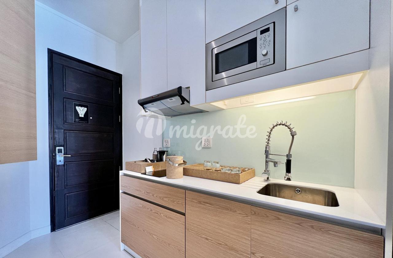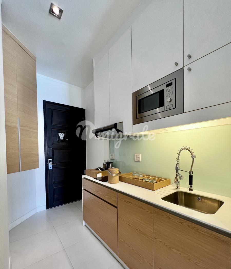 Modus Beachfront Condominium — это проект в 20 м от пляжа Вонгамат, построенный в 2013 году. Комплекс состоит из двух 5-этажных корпусов и имеет общий бассейн, сауна, тренажерный зал, сад/барбекю, магазин-ресторан/бар, wi-fi, лифт, парковка, круглосуточная охрана, видеонаблюдение Квартира находится на 3м этаже, полностью меблирована и декорирована, и продается все включено