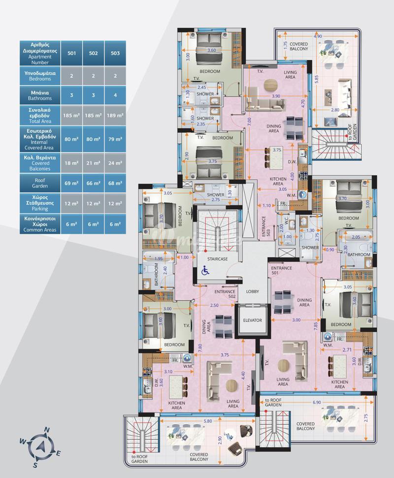 Апартаменты оснащены кухнями высокого дизайна, гранитными столешницами, душевыми кабинами. Современные технологии и джакузи на некоторых верандах. Имеется крытая парковка и кладовые.
