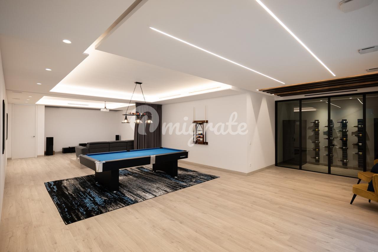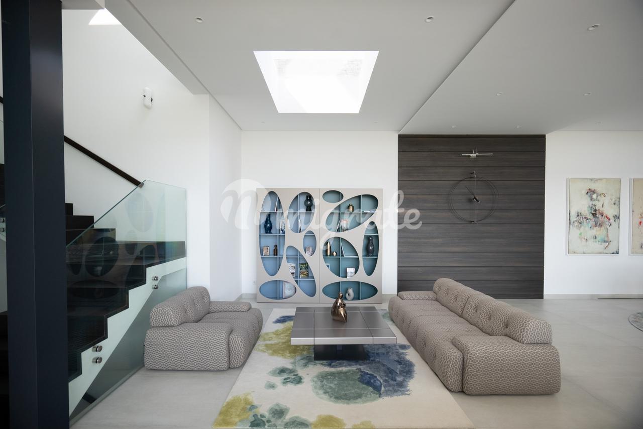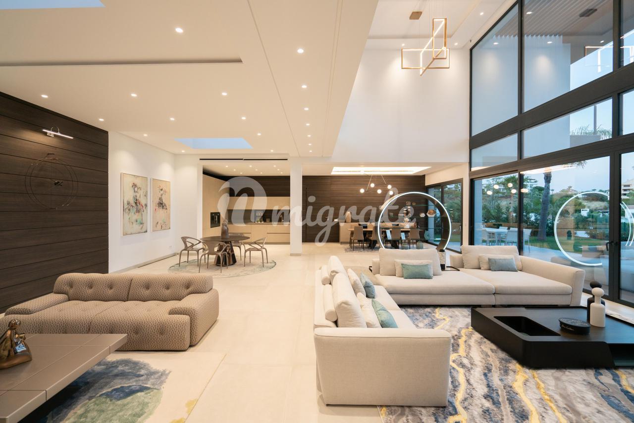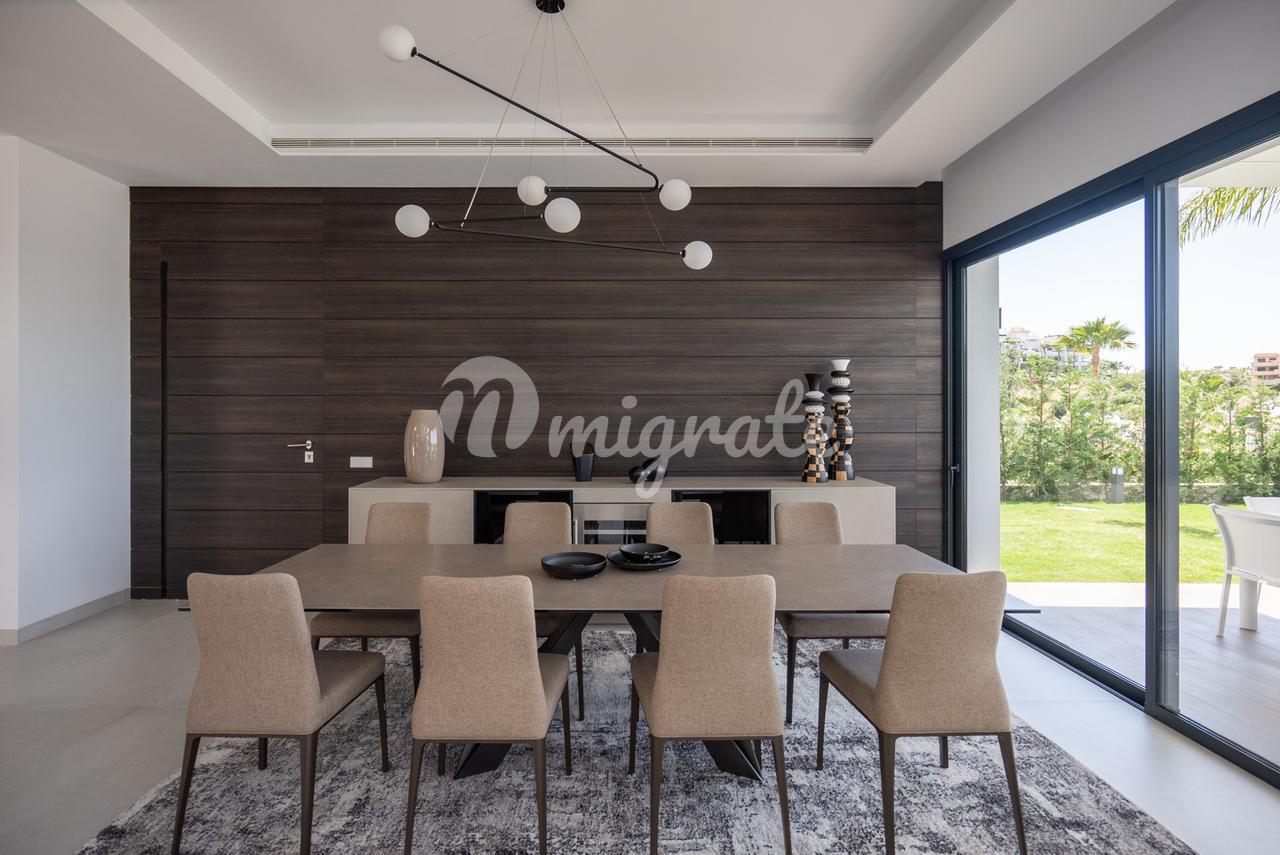 Вилла площадью 630 м2 построена на участке площадью 1285 м2. Он распределен по трем уровням. На первом этаже есть потолки двойной высоты и большие окна, которые дают свет и яркость в течение дня, смешивая внутреннее и наружное пространство. Полукрытая веранда, откуда вы можете наслаждаться видом на поле для гольфа и море из пейзажного бассейна. Открытая планировка идеально сочетает в себе гостиную, столовую и полностью оборудованную кухню. Спальная зона состоит из трех спален с ванными комнатами. В главной спальне есть большая гардеробная. Цокольный этаж предназначен для развлечений и включает в себя многофункциональную комнату с бильярдным столом, винный погреб, бар и кинозал. Существует также дополнительная спальня с ванной комнатой, которая может быть использована в качестве помещения для гостей или персонала. Машинное отделение и прачечная завершают планировку этого уровня.