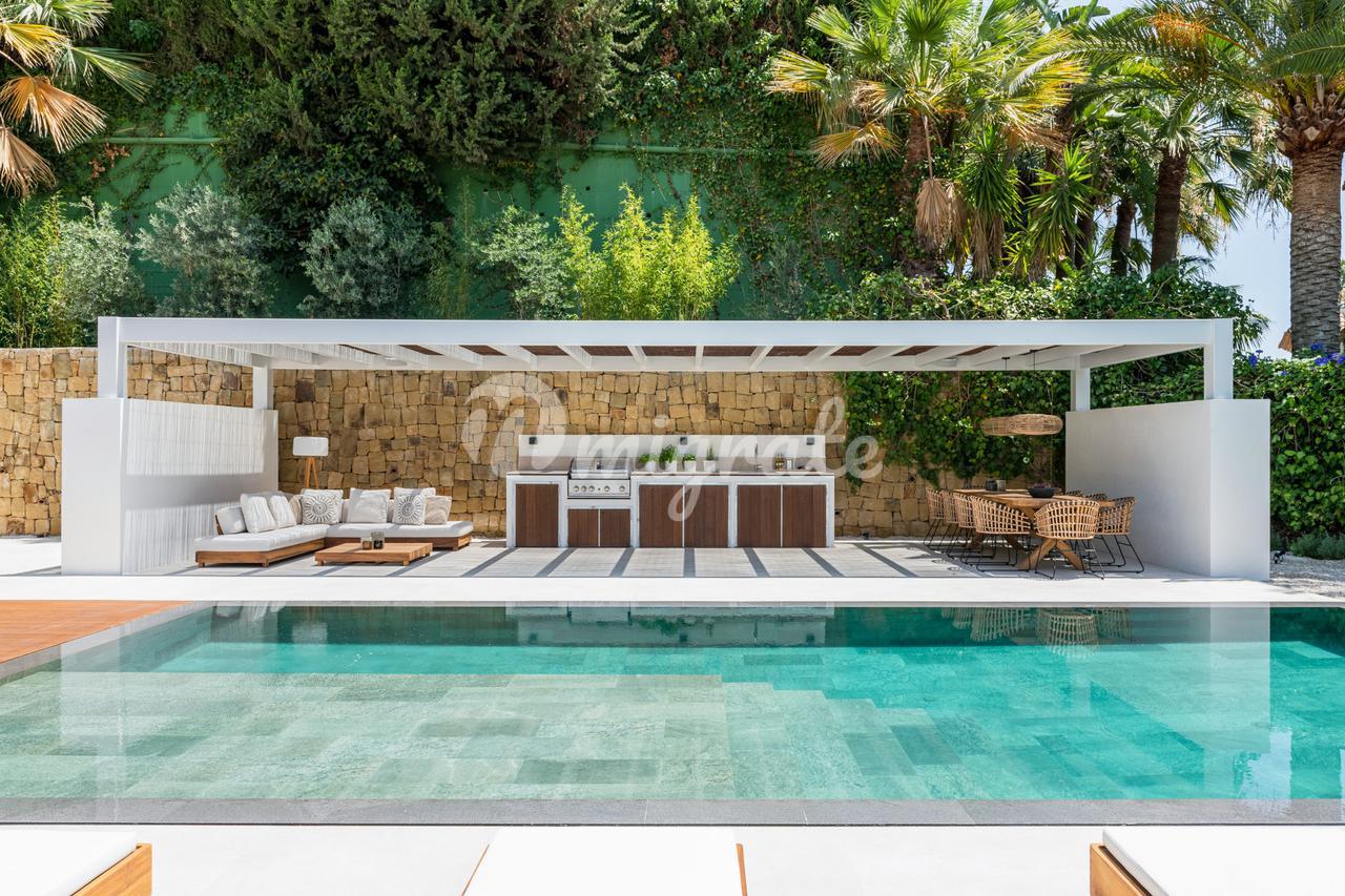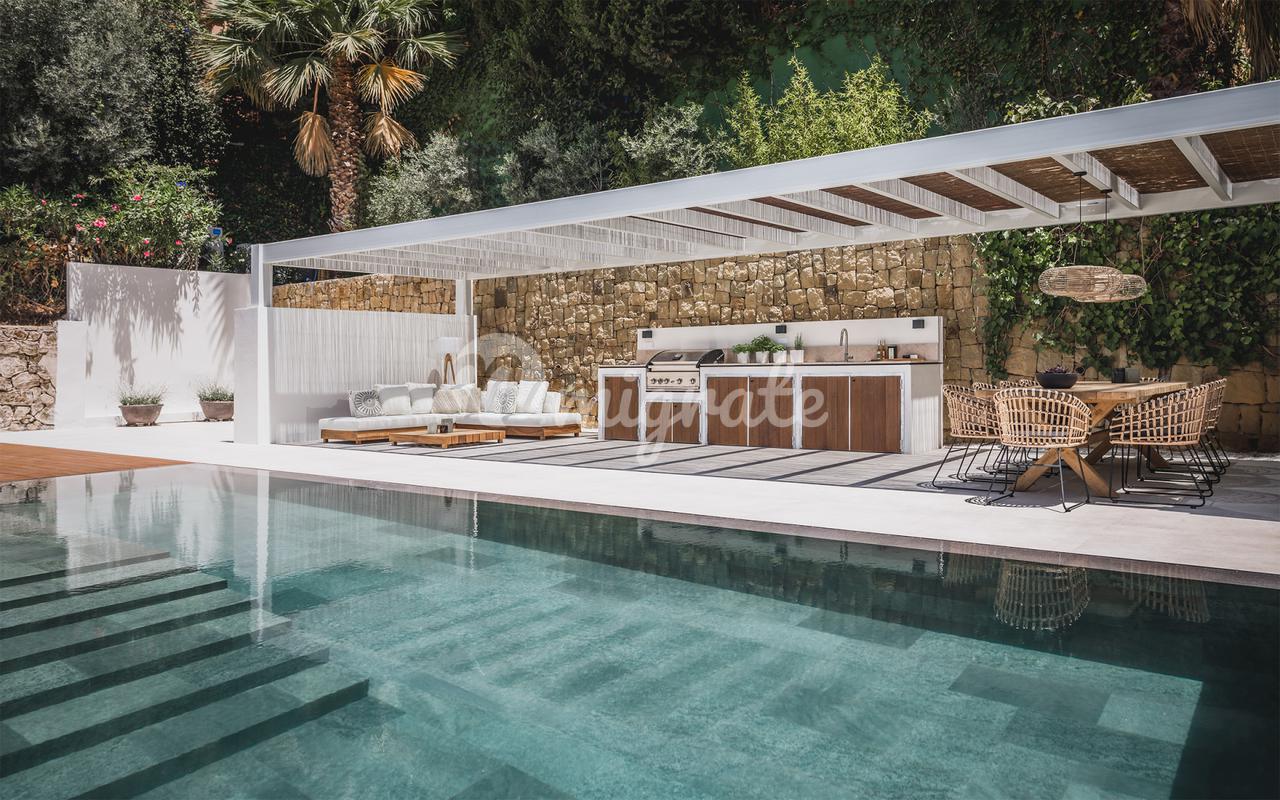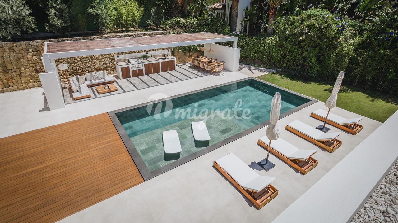 Бассейн с подогревом имеет деревянный настил и встроенные шезлонги, а также красивую чирингито с барбекю/кухней на открытом воздухе, обеденной зоной и полукрытой зоной отдыха. Домотехника, двойное остекление, сигнализация, стереосистема Dolby, резервуар для воды, видеодомофон и Wi-Fi/интернет, среди прочего.