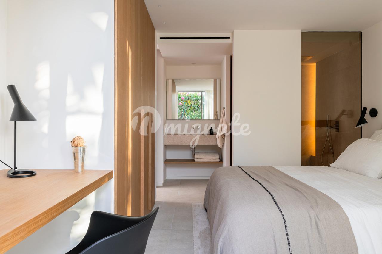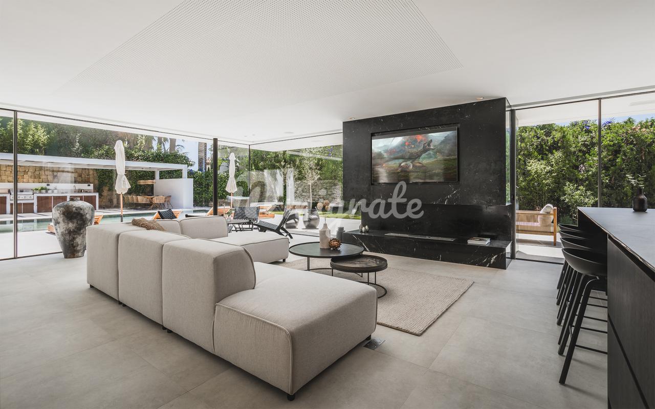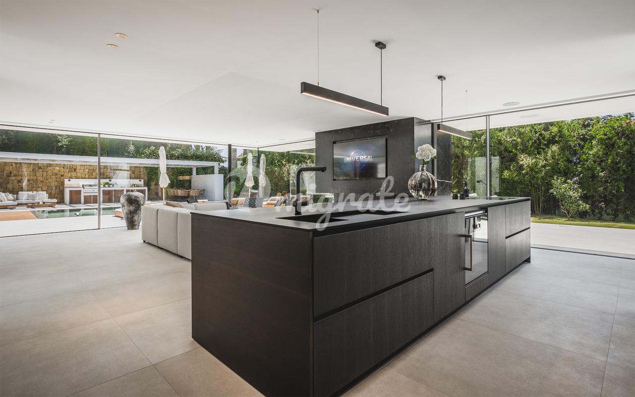 Он состоит из четырех спален с ванными комнатами и гостевого туалета. Кухня открытой планировки с красивой деревянной дизайнерской мебелью, впечатляющим черным центральным островом и первоклассной бытовой техникой Gaggenau. Большие окна от пола до потолка, соединяющие внутреннее и внешнее пространство, а также солярий с летней кухней и зоной отдыха, откуда открывается вид на поле для гольфа.